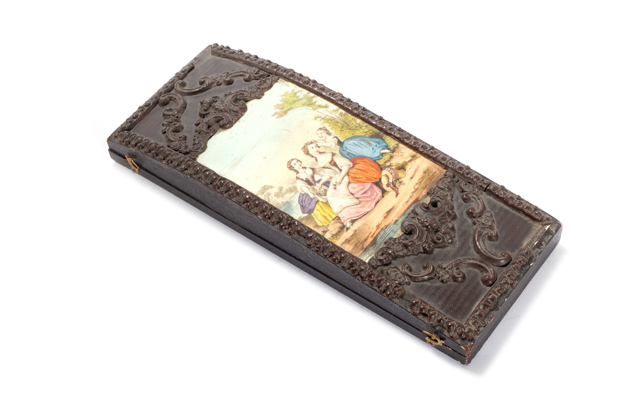 in astuccio in pelle e legno, decorato con stampa raffigurante scena campestre