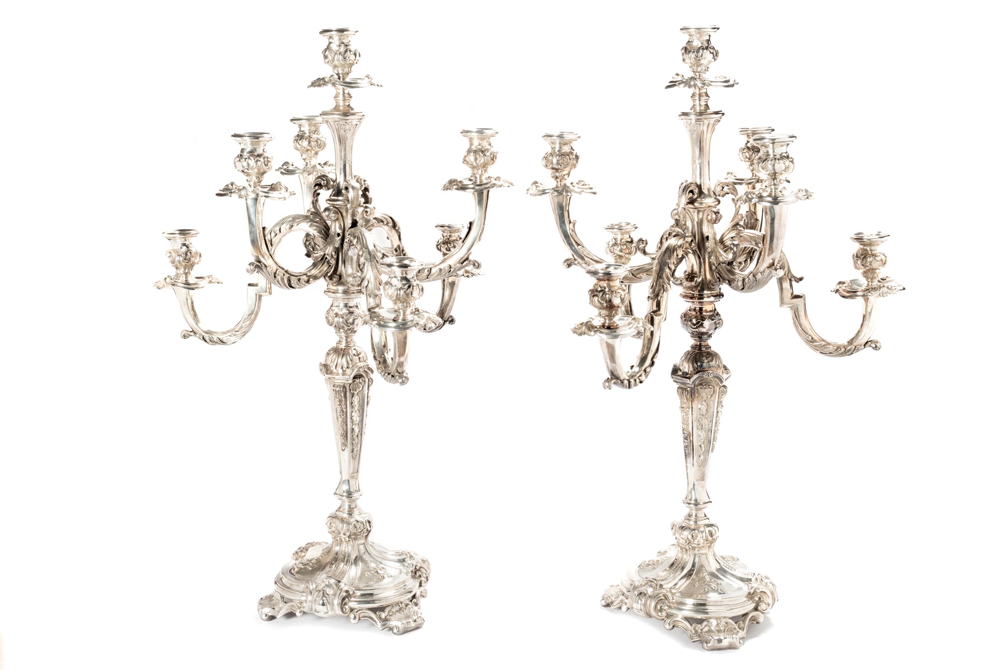 Coppia di grandi candelabri in argento a sette braccia in stile barocco, secolo XX