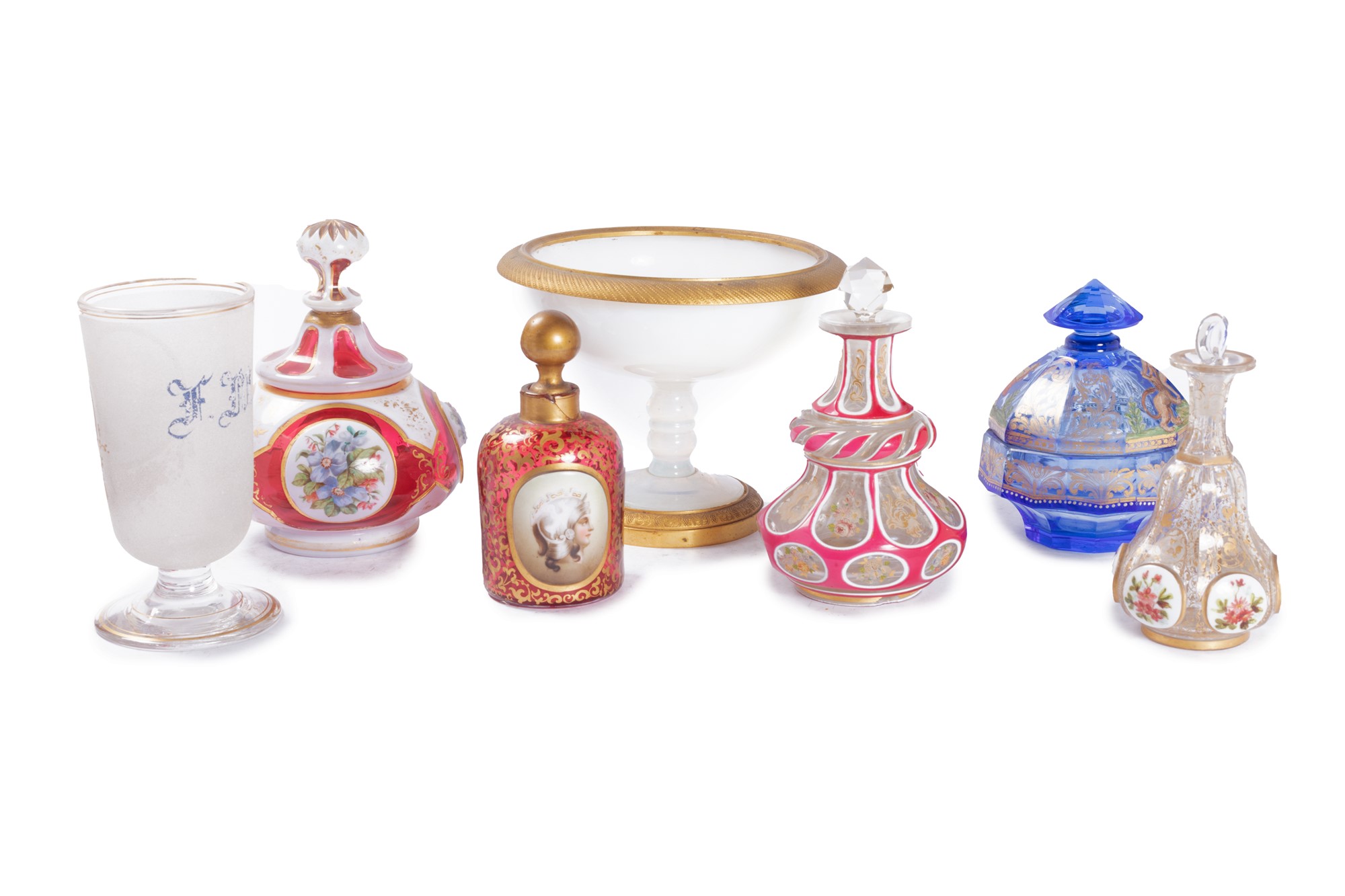 Lotto composto da sette oggetti in vetro e cristallo di Boemia, secolo XIX