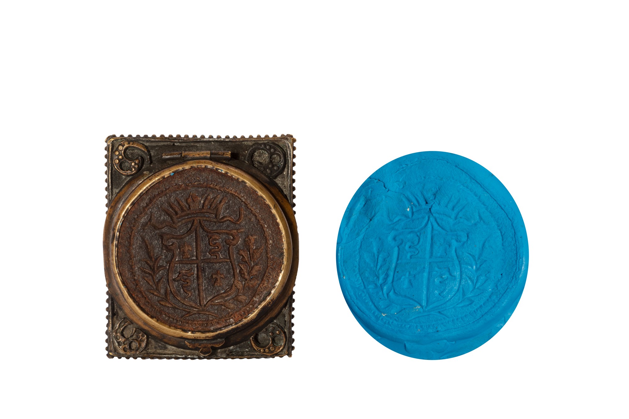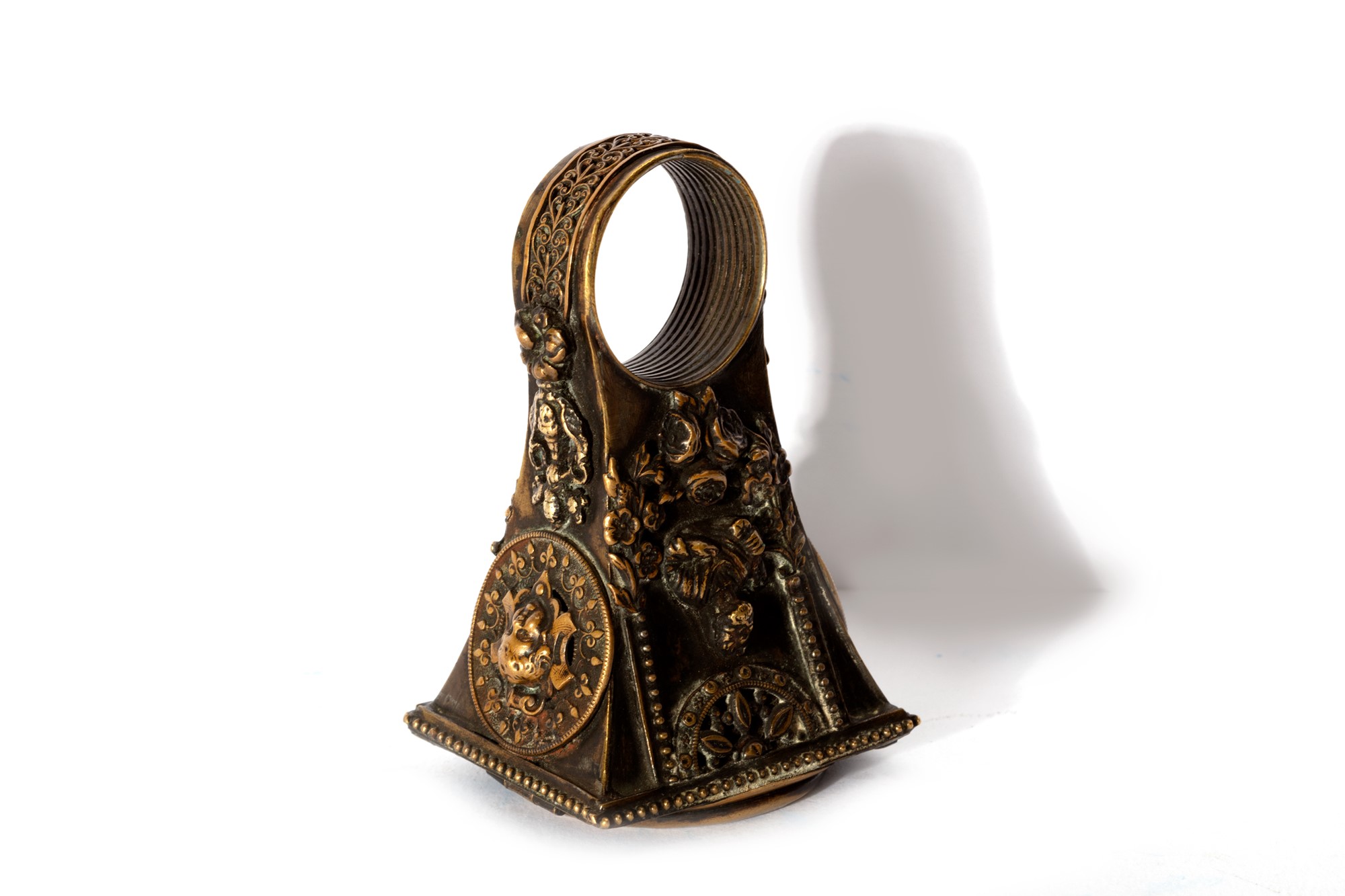 Antico anello a sigillo in bronzo e ferro, di gusto eclettico, con contenitore per ceralacca