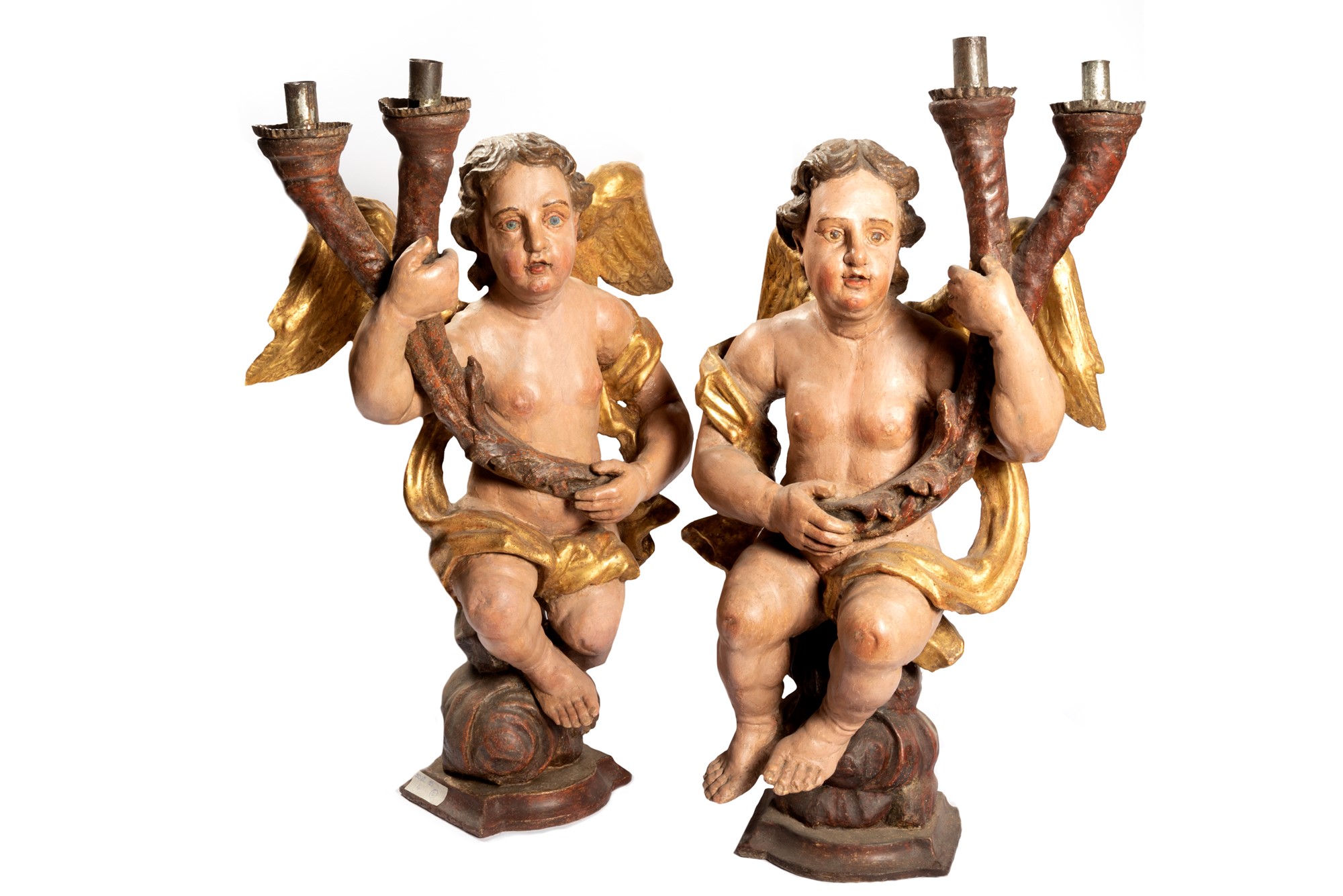Coppia di angeli reggi cero in legno laccato e dorato, secolo XVII
