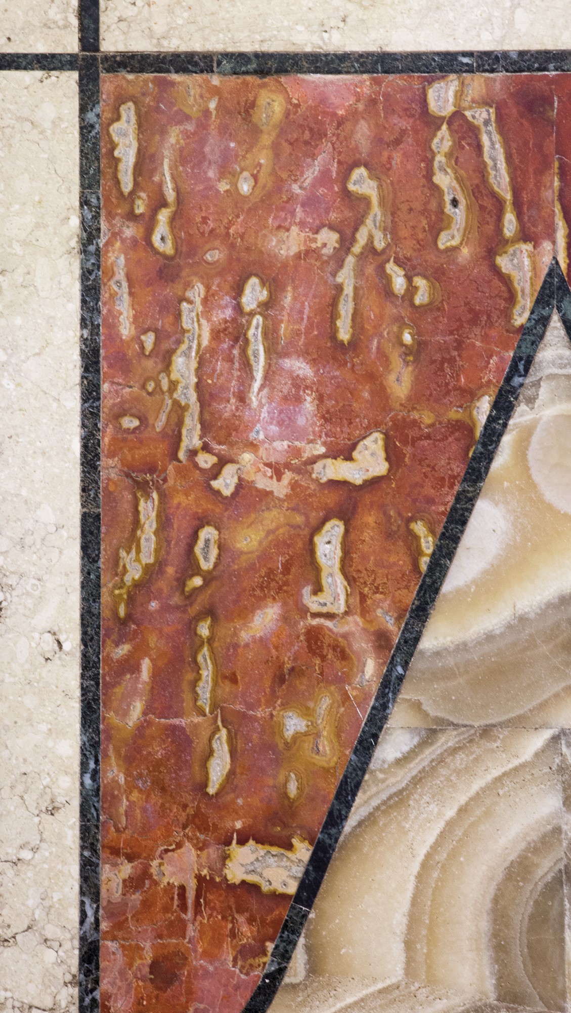 Decorato al centro con motivo a losanga lastronato in antico alabastro oniciato, filettato in marmo verde scuro venato e inserito in largo pannello lastronato in lumachella a fondo rosso aranciato con inclusioni fossili marine. Bordo esterno formato da lastre piene in marmo beige modernoDecorato al centro con motivo a losanga lastronato in antico alabastro oniciato, filettato in marmo verde scuro venato e inserito in largo pannello lastronato in lumachella a fondo rosso aranciato con inclusioni fossili marine. Bordo esterno formato da lastre piene in marmo beige moderno