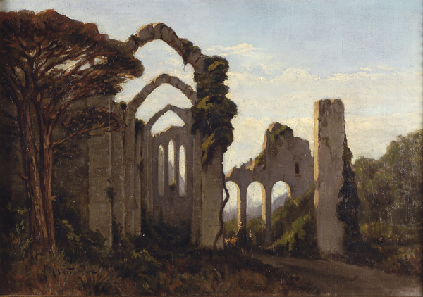 Achille Vertunni (Napoli, 1826 - Roma, 1897) PAESAGGIO CON ROVINE E PASTORE Olio su tela, cm. 36,7x52,7 Firmato in basso a sinistra: “A. Vertunni”.