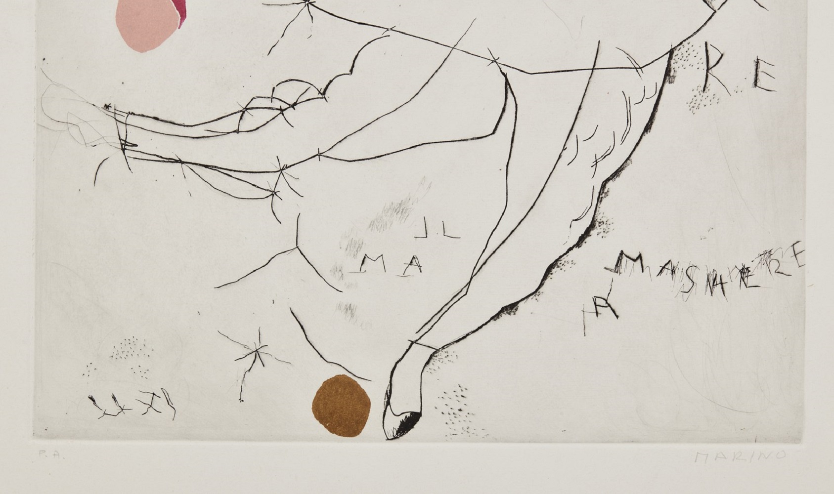 MARINI MARINO (1901 - 1980) Dalla serie I Personaggi. Danza minima I. . 1973. Acquaforte, acquatinta e puntasecca. Cm 70,00 x 99,00. P.a. Tiratura e firma in basso a matita, Dimensione lastra: 64x49 cm. Carta Magnani. Editore: Albra, Torino. Stampatore: Il Cigno, Roma. Edizione totale: 50 esemplari firmati e numerati da 1/50 a 50/50; 25 esempalri firmati e numerati da I/XXV a XXV/XXV +12 p.d.a. Pubblicazione: Marino Marini Catalogo ragionato dell'Opera grafica 1919 - 1980 a cura di Giorgio e Guido Guastalla, Edizioni Graphis Arte, Livorno, 1990, p. 218, tav. A171. . Cornice presente