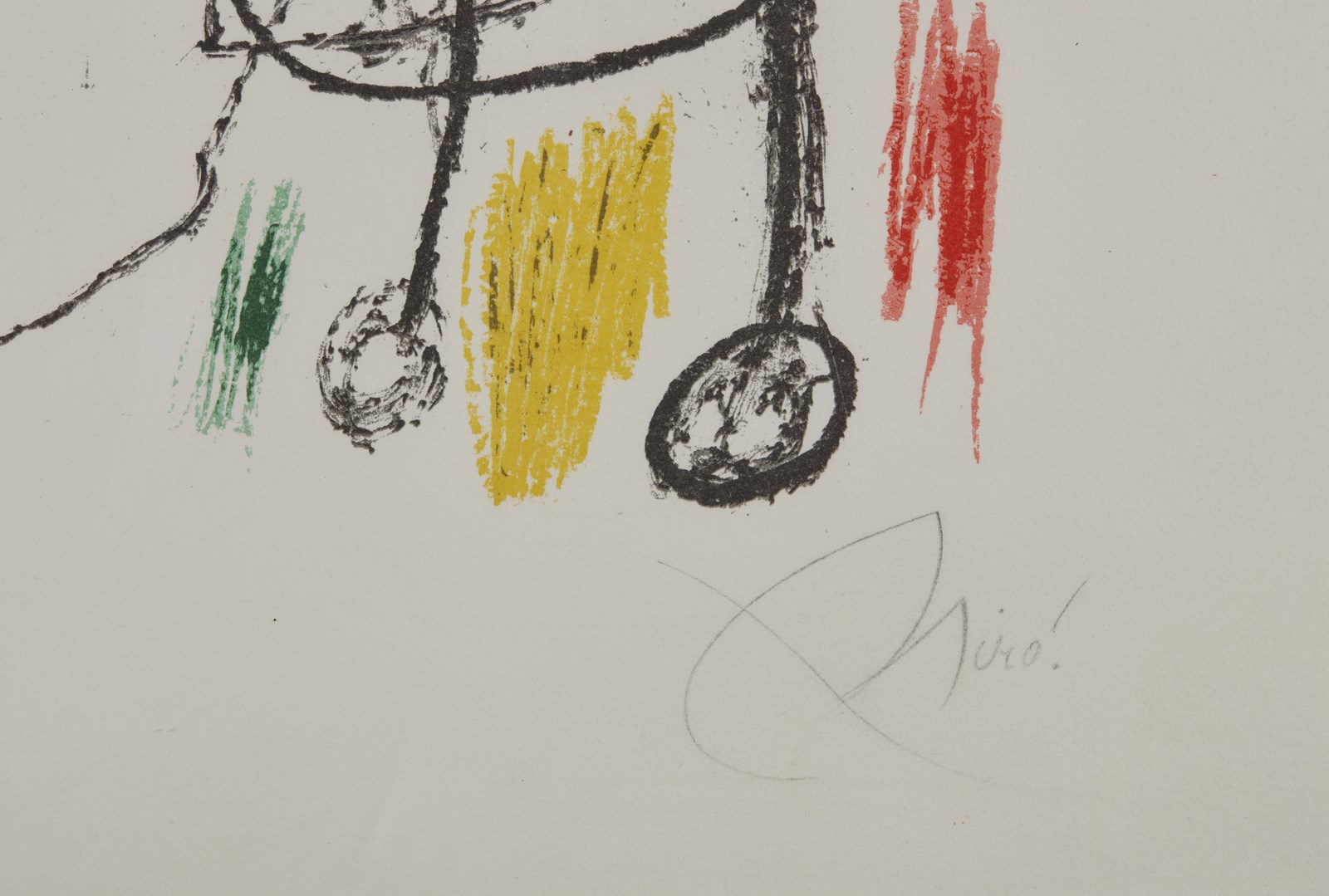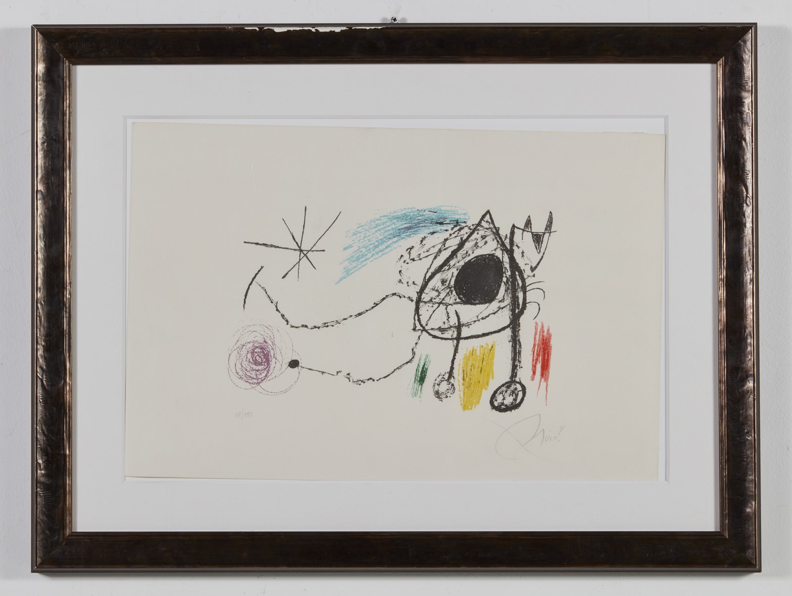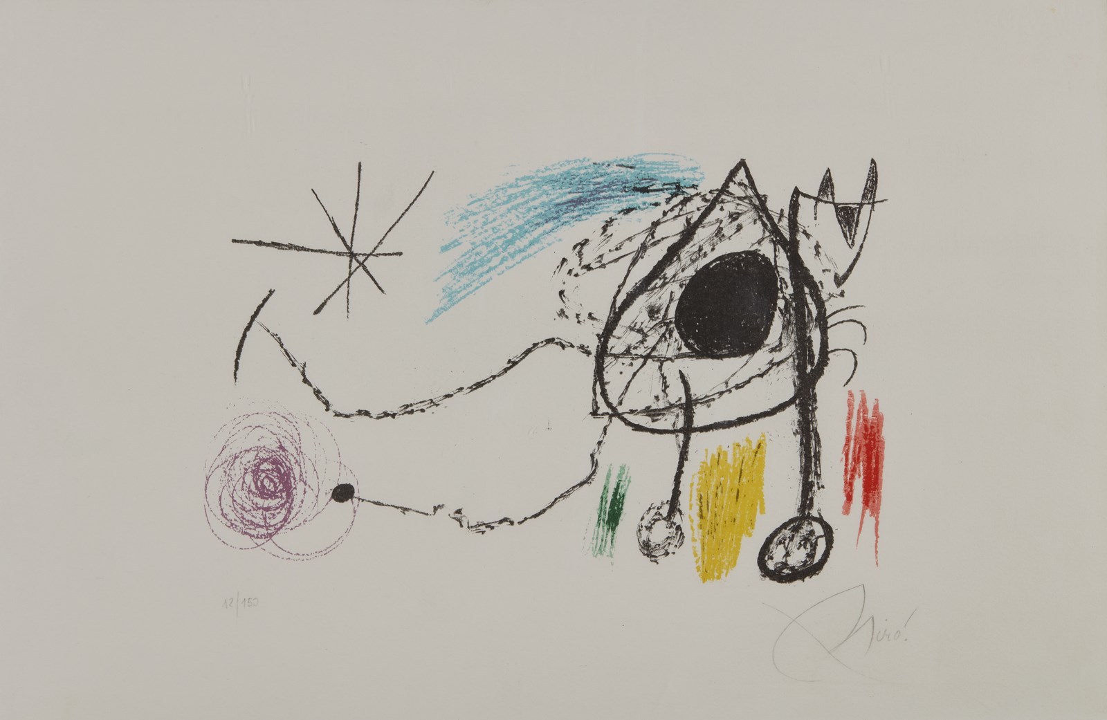 MIRO' JOAN (1893 - 1983) Sobreteixims I Escultures. 1972. Litografia. Cm 57,00 x 38,00. 12/150. Tiratura e firma in basso a matita. Edizione totale: 150 esemplari, stampati su carta Guarro, firmati a matita e numerati dal 1/150 al 150/150. Pubblicazione: Joan Miró, the illustrated books : catalogue raisonné a cura di P. Cramer e R.M. Malet, 1989, pag. 392. Cornice presente