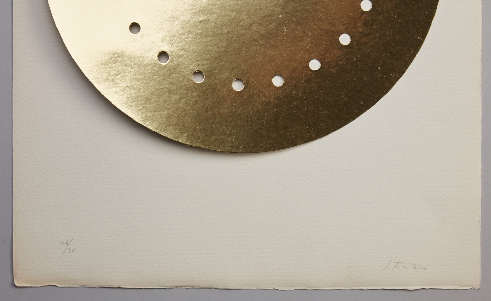 FONTANA LUCIO (1899 - 1960) Disco spaziale (oro). Serigrafia. Cm 35,00 x 50,50. 1966-1967. 24/30. Tiratura e firma in basso a matita. Disco in cartone dorato con 21 buchi applicato su cartoncino. Stampatore G. Upiglio, Milano; Editore Edizioni della Quercia. Dimensione disco: 30x30 cm. L'opera fu realizzata per un’edizione collettiva alla quale Lucio Fontana, Heinz Mack, Gunther Uecker e Nanda Vigo contribuirono con tre opere ciascuno; l’edizione conteneva anche un testo poetico di Nanni Balestrini. Pubblicazione: Lucio Fontana. Incisioni, grafica, multipli, pubblicazioni... a cura di H. Ruhè, C. Rigo, Edizioni Reverdito, 2007, p.154 n°M-4, dove viene indicata una tiratura di 21 esemplari + 9 in numeri romani Provenienza: Collezione Lana, Milano.