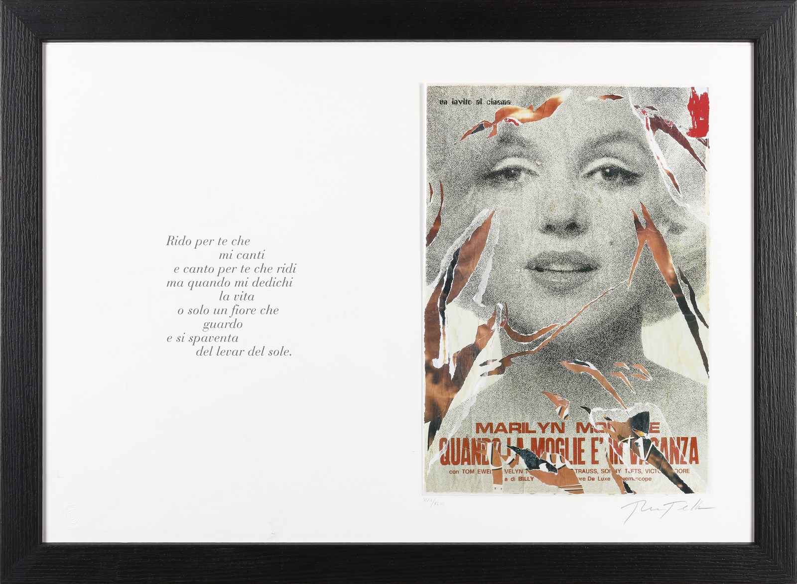 ROTELLA MIMMO (1918 - 2006) Quando la moglie è in vacanza. 2005. Decollage. Cm 70,00 x 50,00. XVII/XLIII. Tiratura e firma in basso a matita.Grafica proveniente dal volume "Marilyn Bellezza eterna”, di Mimmo Rotella e Alda Merini. Ogni foglio è abbinato ad una poesia inedita di Alda Merini.