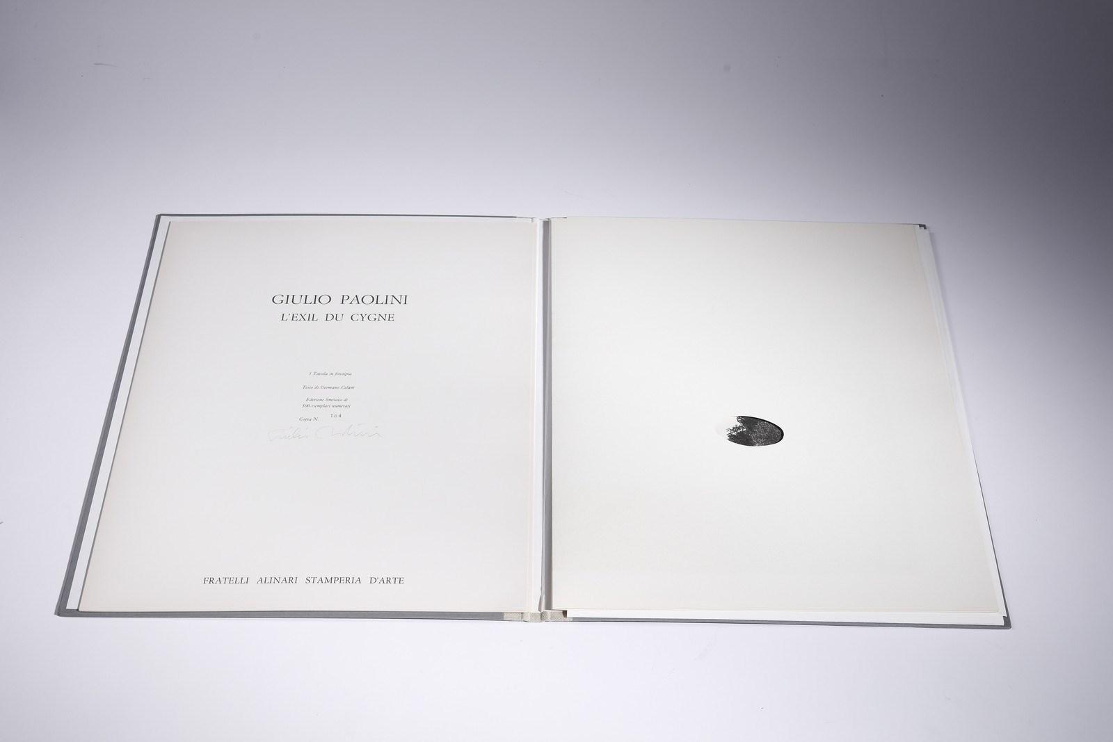 PAOLINI GIULIO (n. 1940) L'exil du cygne. Fototipia. Cm 40,00 x 50,00. 164/500. Tiratura e firma a matita sul colophon. Cartella completa composta da n.1 foglio. Dimensioni grafica aperta: 50x80 cm. Testi di Germano Celant. Edizione totale: 500 esemplari numerati. Stampatore: Fratelli Alinari Stamperie d'arte, Firenze.