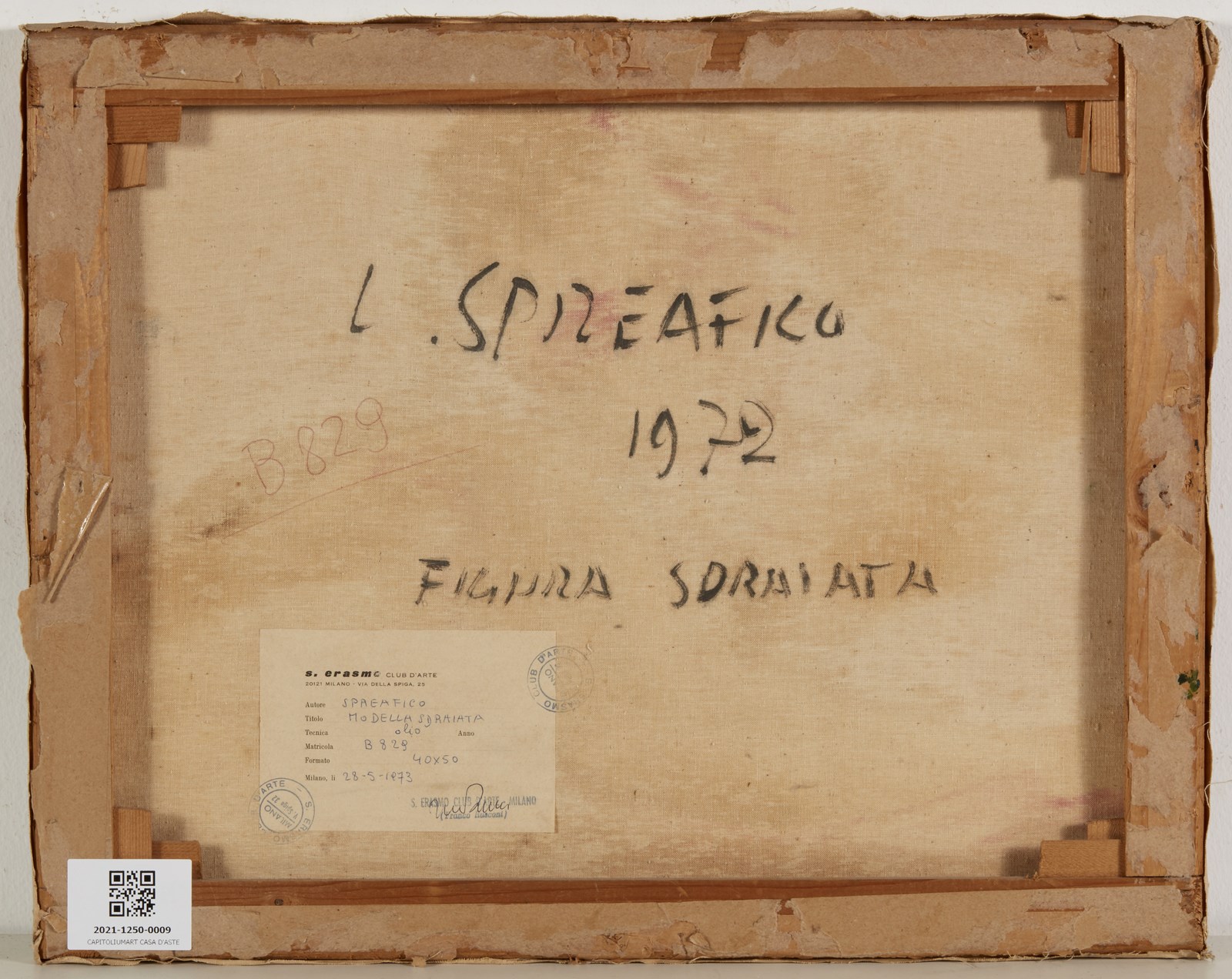 SPREAFICO LEONARDO (1907 - 1974) Figura sdraiata. 1972. Olio su tela . Cm 50,00 x 40,00. Firma in basso a sinistra. Al retro firma, titolo, anno e cartiglio descrittivo S. Erasmo Club Arte, Milano. Opera archiviata presso S.Erasmo Club Arte, Milano, come da documentazione fotografica allegata all'opera riportante il relativo numero d'inventario e la firma dell'artista.