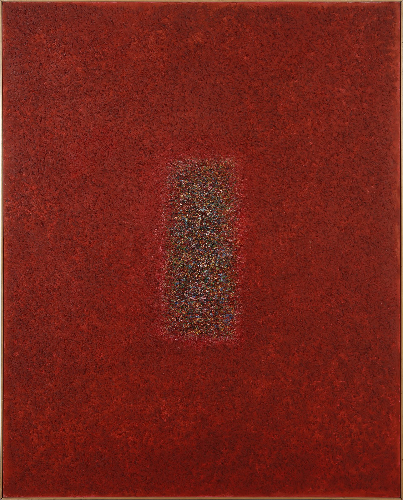 BOILLE LUIGI (n. 1926) Centralità rosso. Tecnica mista su tavola. Cm 130,00 x 162,00. Al retro titolo, firma e anno.