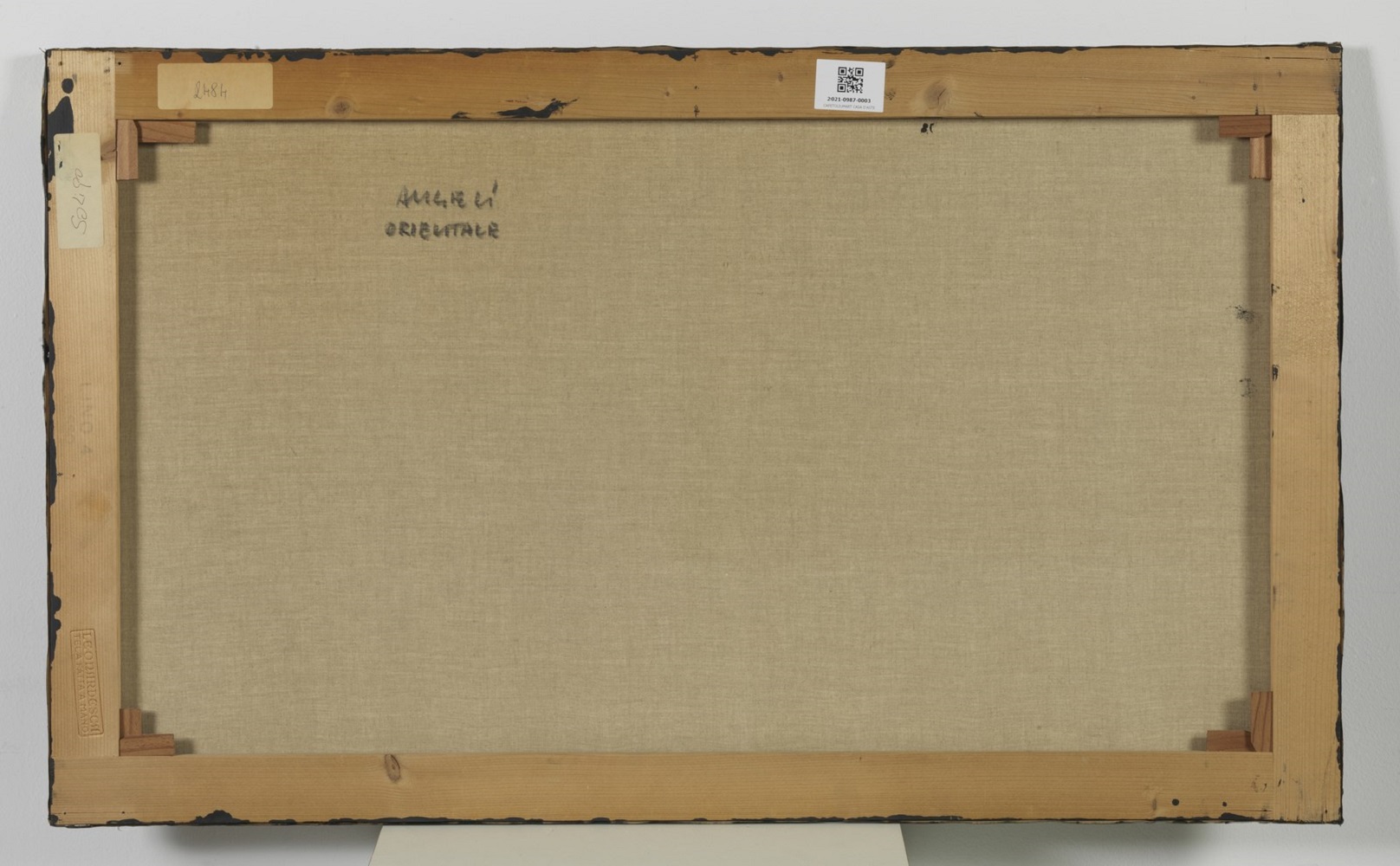 ANGELI FRANCO (1935 - 1988) Orientale. Acrilico su tela. Cm 100,00 x 60,00. Firma e titolo al retro. Opera archiviata presso l'Archivio Franco Angeli, Roma, come da documentazione fotografica allegata all'opera riportante il relativo numero d'inventario. Anni'80. Difetti.