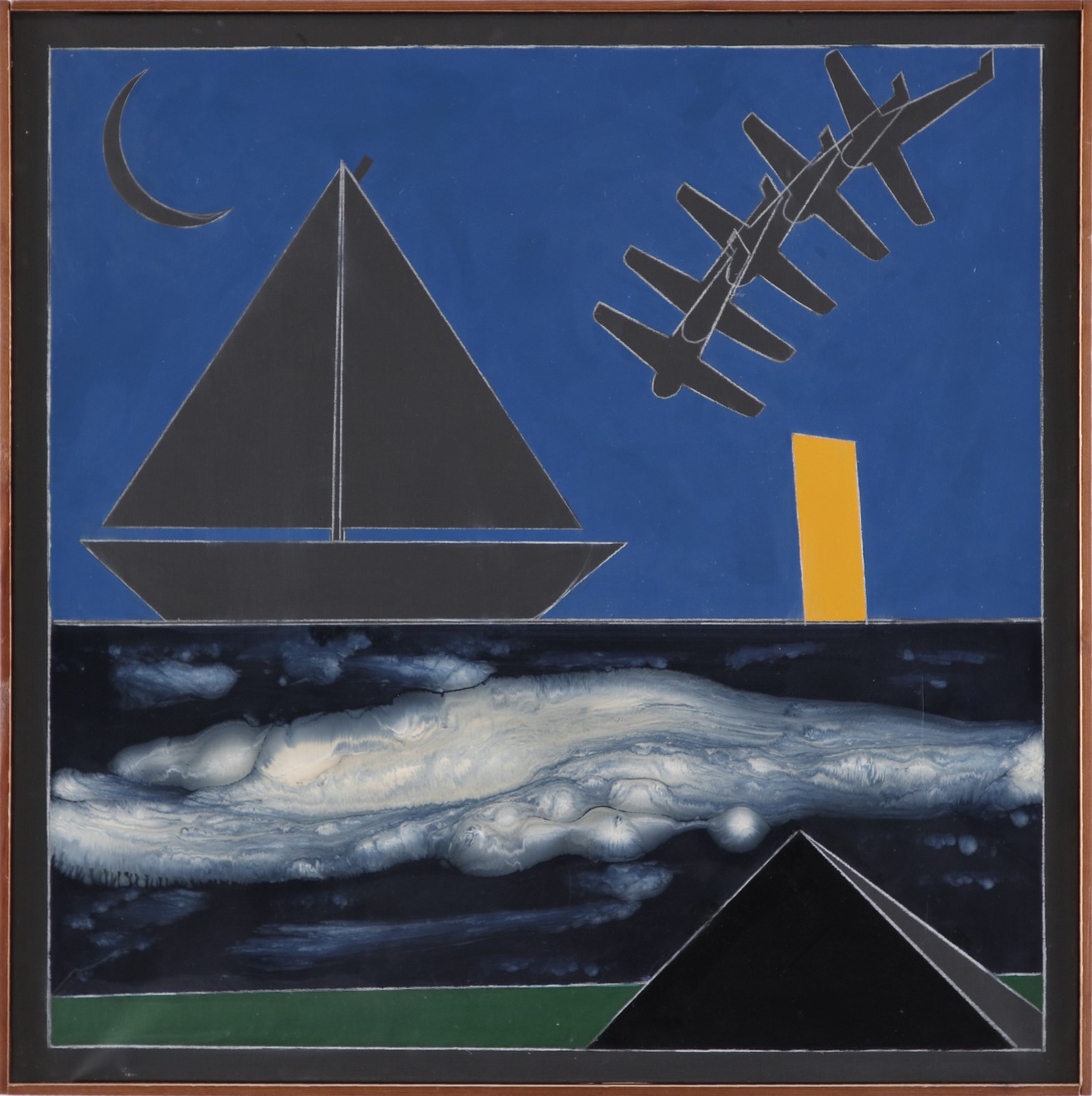 ANGELI FRANCO (1935 - 1988) Velieri. 1984. Tecnica mista su tela. Cm 80,00 x 80,00. Al retro titolo e firma. Opera archiviata presso l'Archivio Franco Angeli, Roma, come da documentazione fotografica allegata all'opera riportante il relativo numero d'inventario. Lievi difetti.