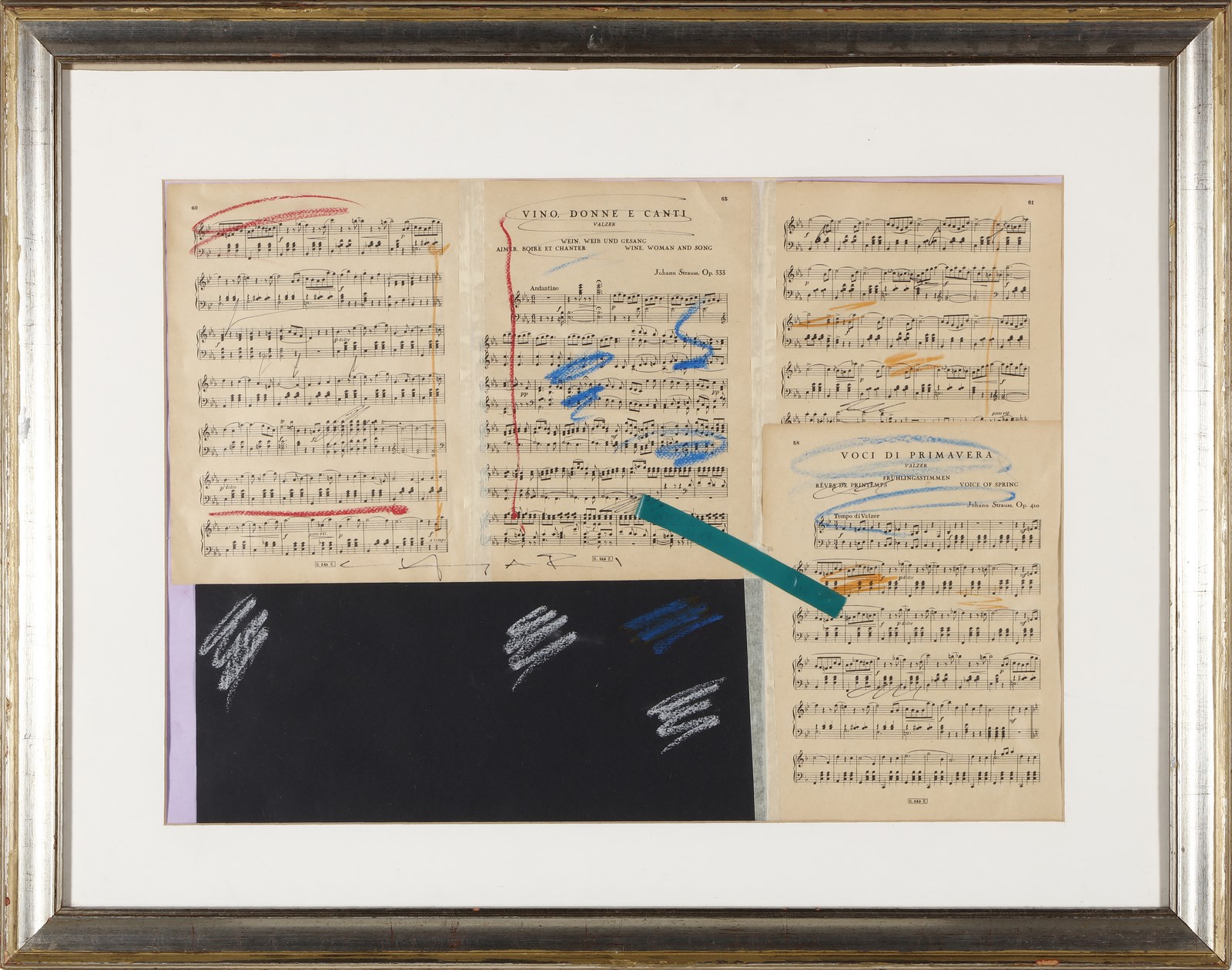 CHIARI GIUSEPPE (1926 - 2007) Vino, donne e canti. Tecnica mista e collage su cartone. Cm 70,00 x 50,00. Firma al centro. Autentica dell'artista su fotografia. Cornice presente