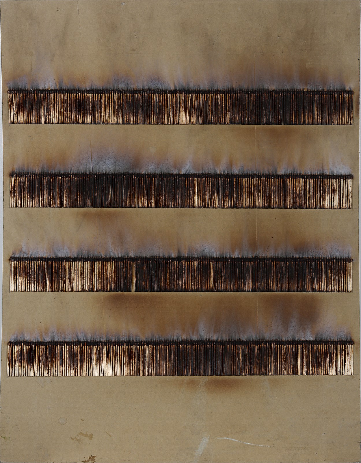 AUBERTIN BERNARD (1934 - 2015) Dessin de feu. 1970. Fiammiferi bruciati su carta. Cm 50,00 x 65,00. Al retro firma, anno e cartiglio descrittivo con timbro Galleria Centro, Brescia.