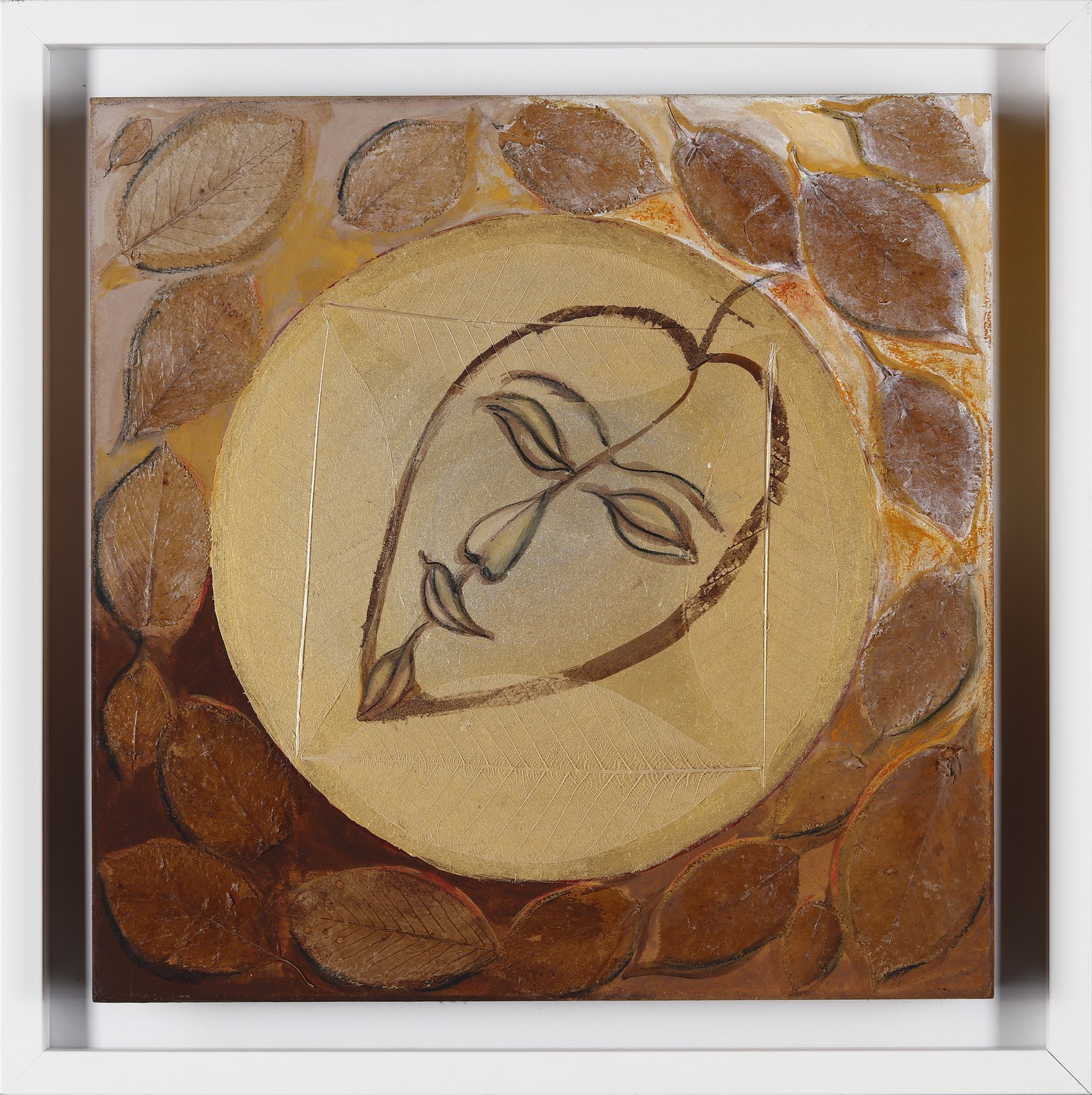 CECCOBELLI BRUNO (n. 1952) In foglia. Tecnica mista su tavola. Cm 40,00 x 40,00. Al retro titolo e firma. Autentica dell'artista su fotografia. Cornice presente