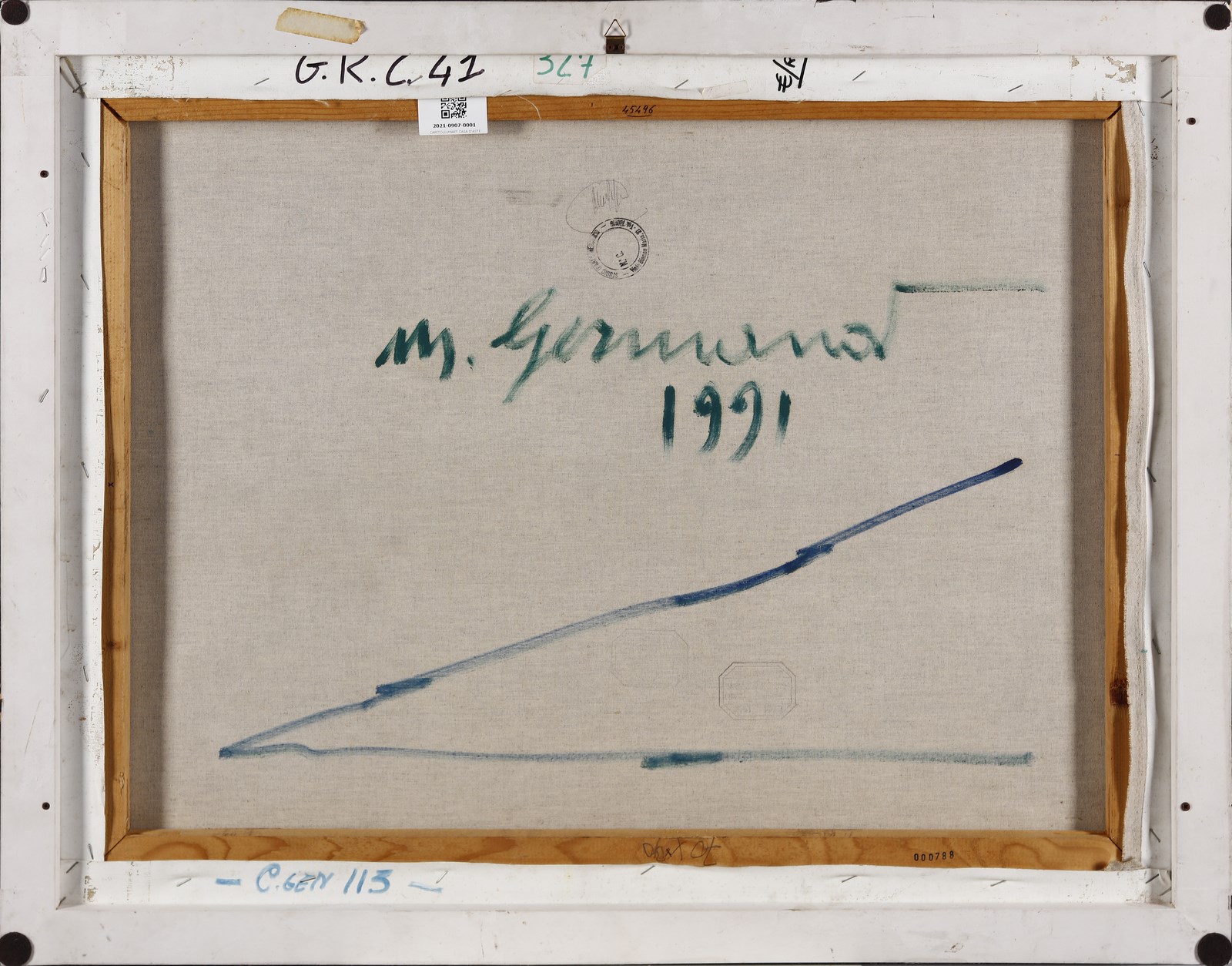 GERMANA' MIMMO (1944 - 1992) Senza titolo. 1991. Olio su tela . Cm 90,00 x 70,00. Al retro firma e anno. Opera archiviata presso Centro d'arte Mercurio - Archivio fotografico generale di Mimmo Germanà, Milano, come da documentazione fotografica allegata all'opera riportante il relativo numero d'inventario. Cornice presente