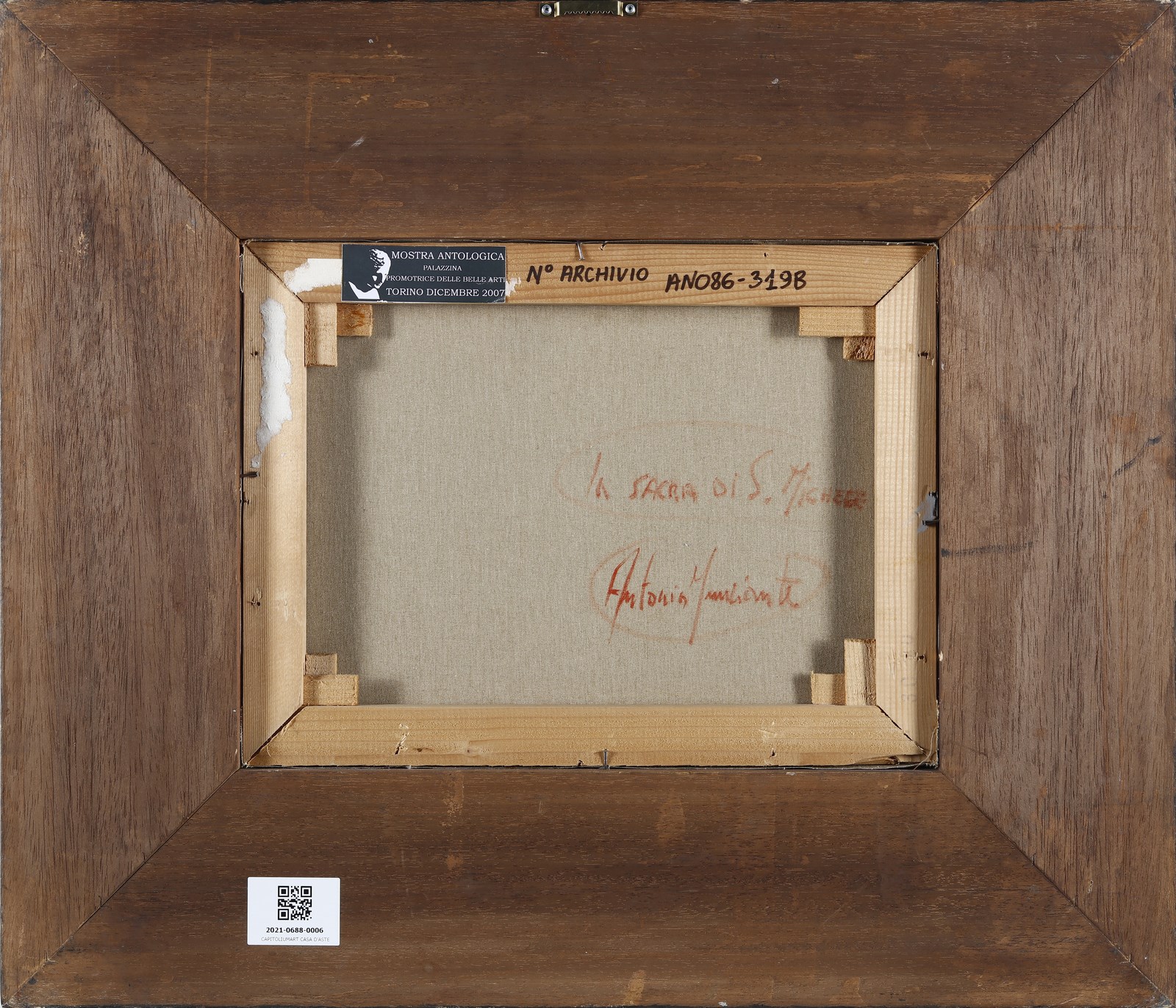 NUNZIANTE ANTONIO (n. 1956) La Sacra di San Michele. 1986. Olio su tela . Cm 40,00 x 30,00. Firma in basso a destra. Al retro titolo e firma. Opera archiviata preso l'Archivio Antonio Nunziante, Torino, come da documentazione fotografica allegata all'opera riportante il relativo numero d'inventario e la firma dell'artista.