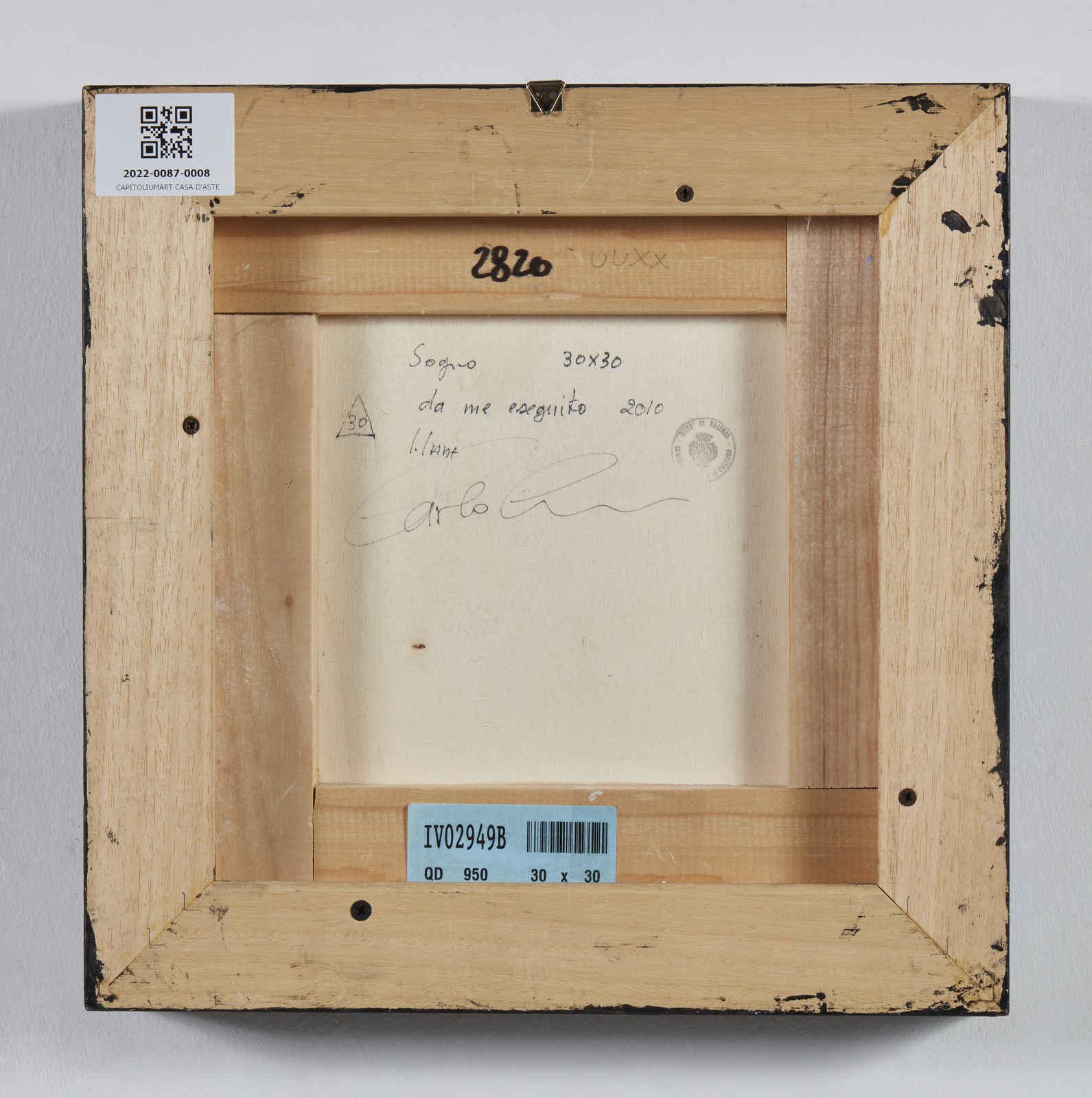 CANE CARLO (n. 1951) Sogno. 2010. Olio su tela e tavola. Cm 30,00 x 30,00. Al retro titolo, firma e anno. Certificato di garanzia Stockmarket, Milano. Cornice presente