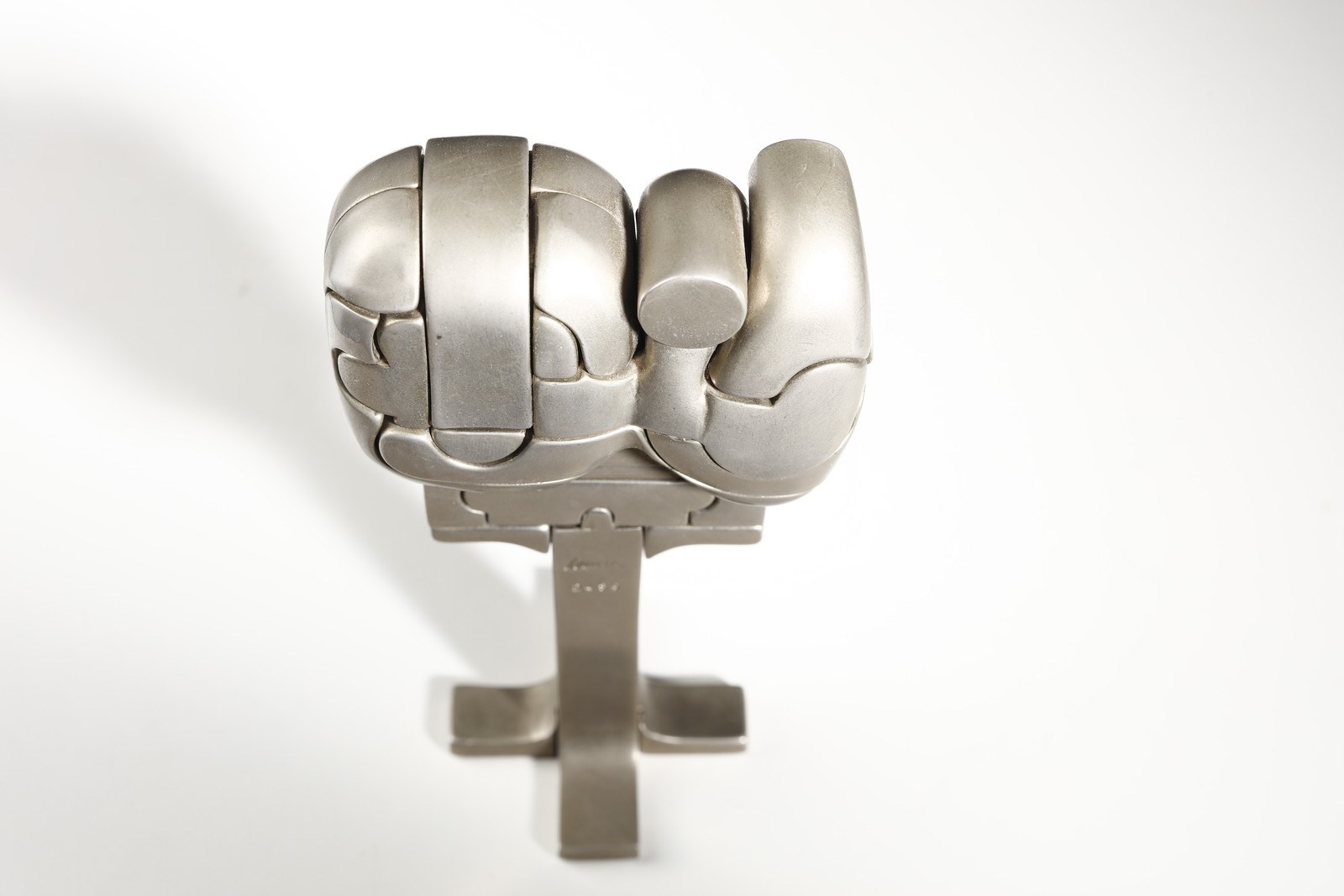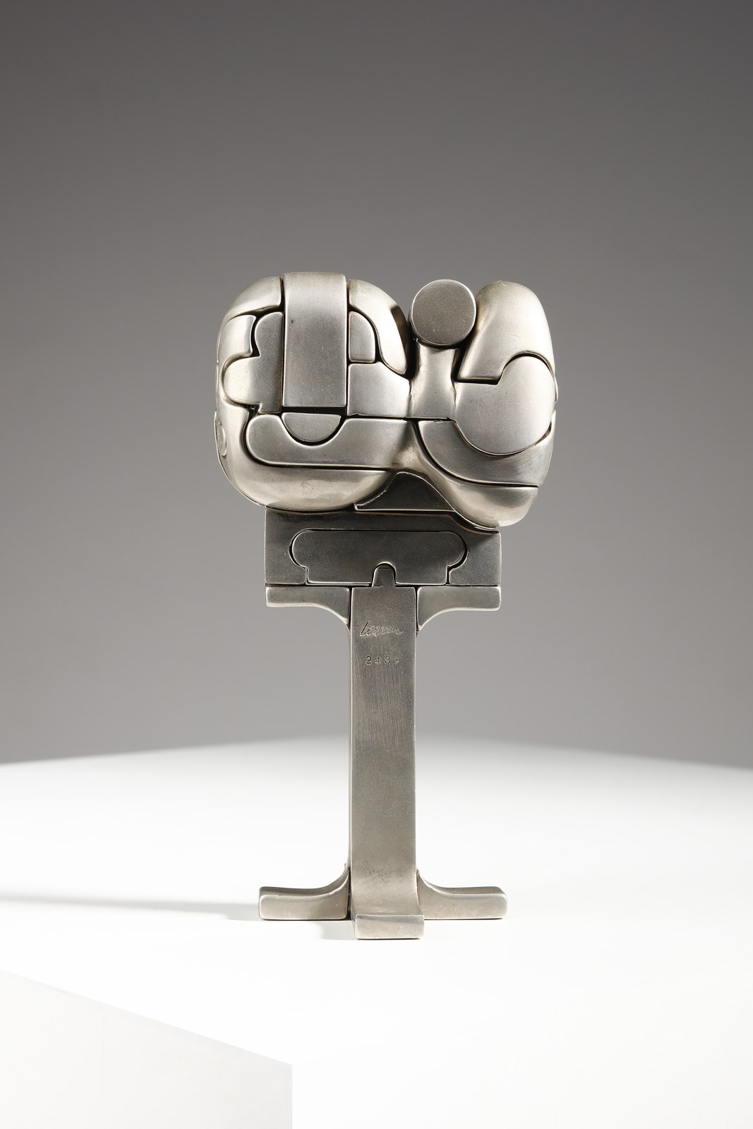 BERROCAL MIGUEL ORTIZ (1933 - 2006) Cristina. Scultura. Cm 15,00. 1969/1970. Es. 2499. Dalla serie Micro - Multiples: scultura smontabile composta da 25 elementi, uno dei quali consiste in un anello. Edizione totale: A) Edizione di Lusso: realizzata in cera persa, comprende: 6 esemplari in oro fino, a 18k, marchiati con un punzone riservato esclusivamente ai pezzi in oro numerati da 1 a 6 e muniti del certificato di autenticità. Nell'anello è incastonata una pietra preziosa + 500 esemplari in argento massiccio, firmati e numerati da 1 a 500. B) Edizione normale: In questa edizione gli elementi formanti la scultura, che vanno da n.14 al 25, sono stati modificati. La scultura che ne risulta ha le seguenti dimensioni: 9.6x6.2x3.7 cm. Gli esemplari sono stati realizzati ad iniezione e l'edizione comprende: 9500 esemplari in metallo nichelato firmati e numerati + n. illimitato di esemplari in materia plastica opaca. Per questa edizione l'artista ha eliminato l'anello riducendo così a 24 il numero degli elementi.