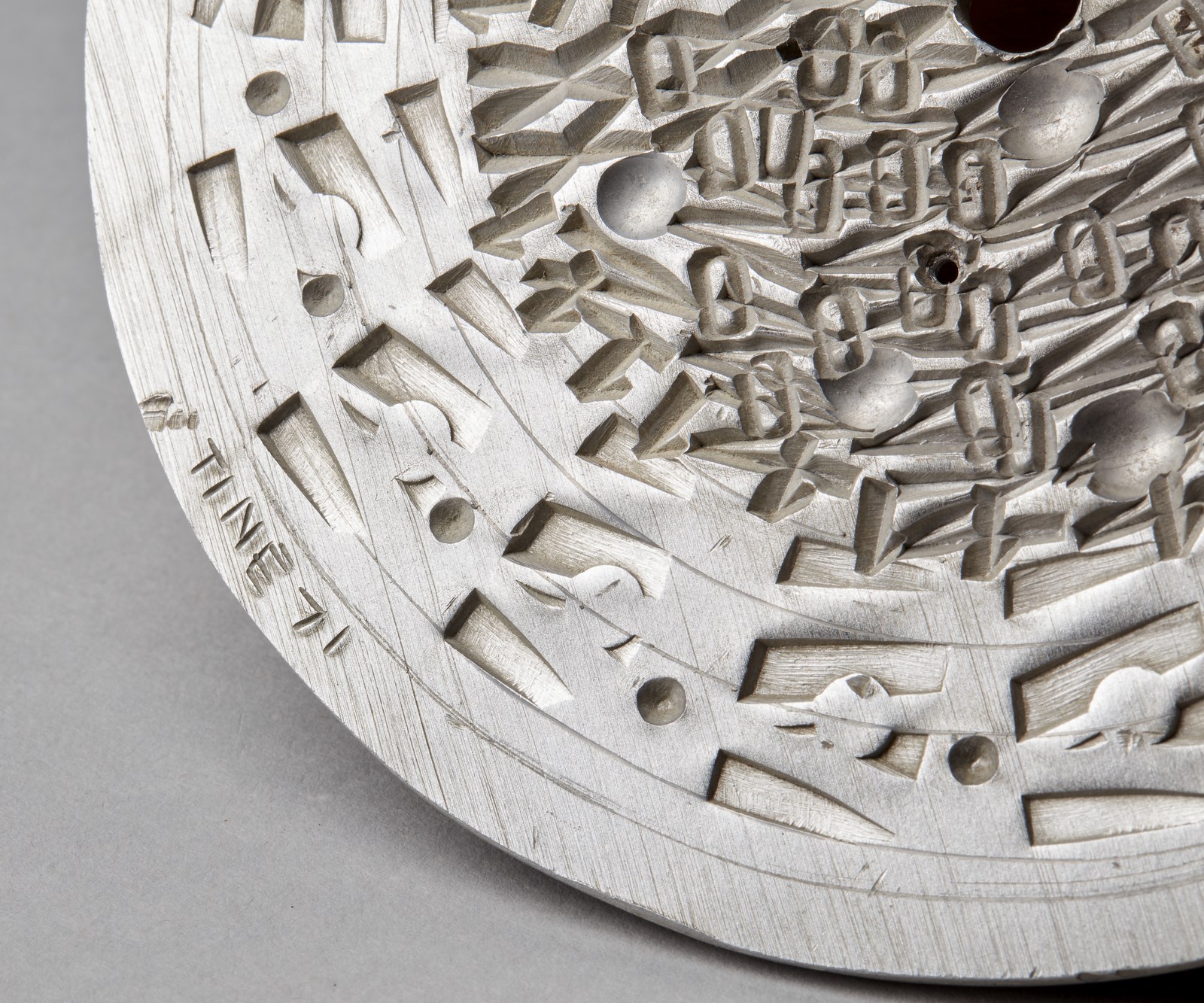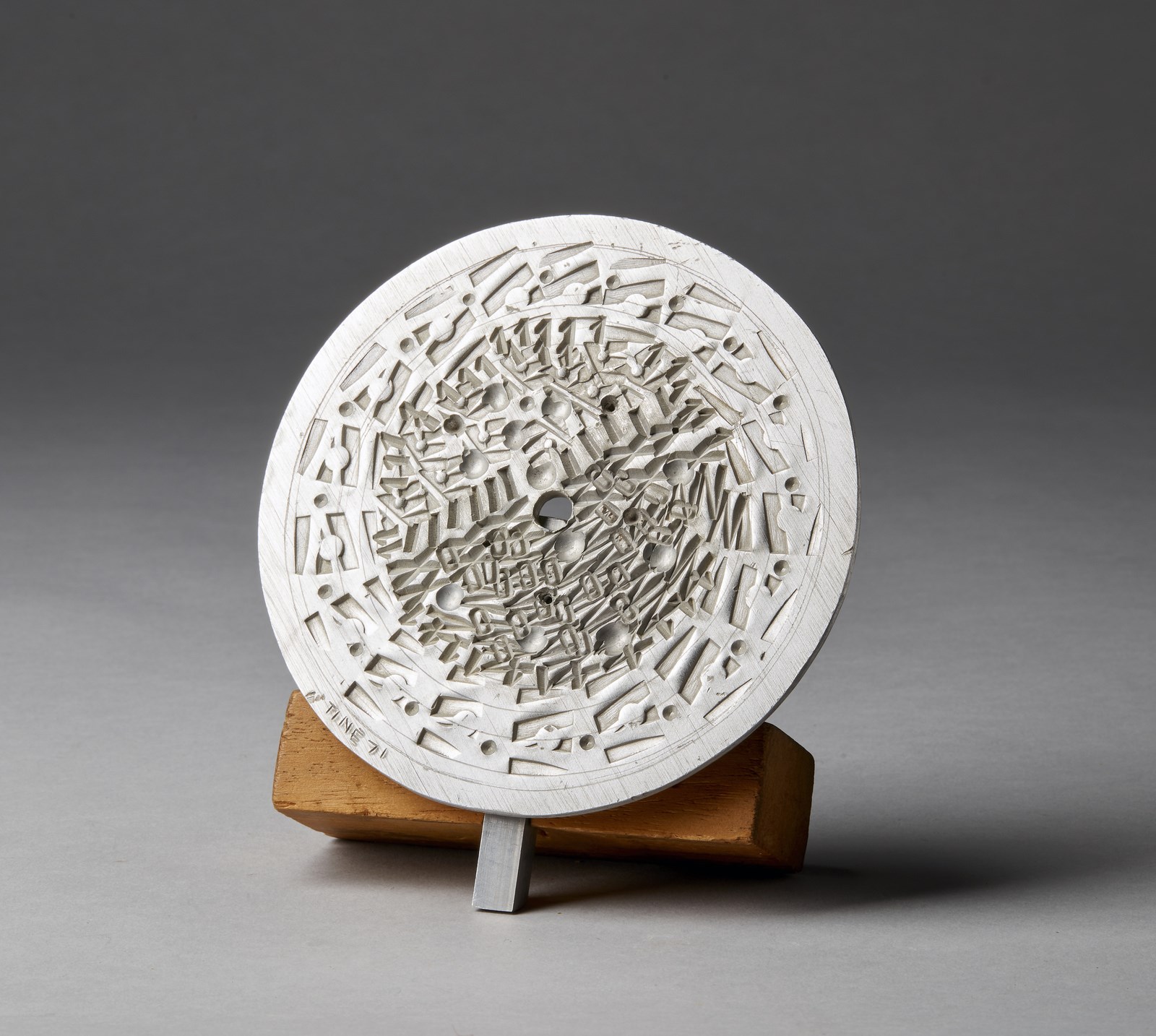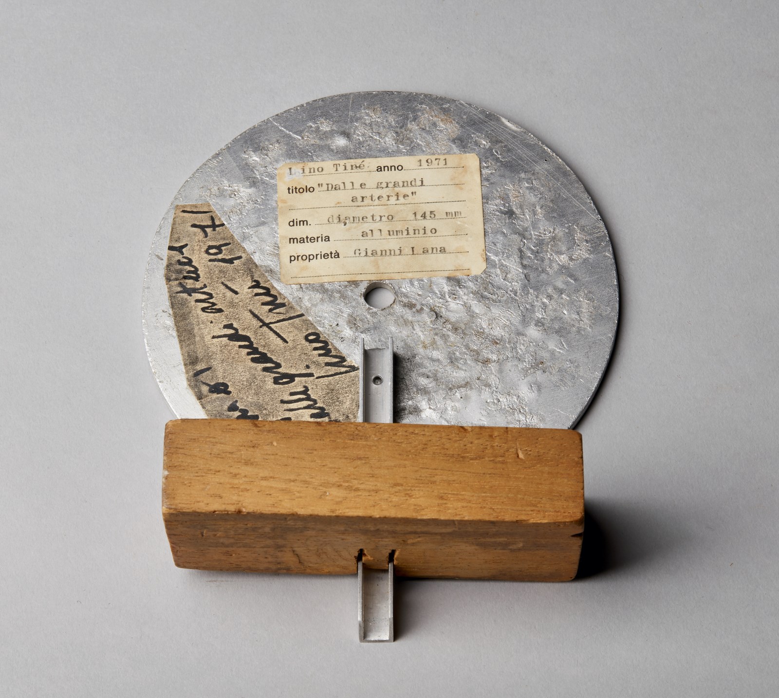 TINE' LINO (n. 1932) Dalle grandi arterie. 1971. Alluminio. Cm 14,50 x 14,50. Firma e anno incise in basso. Il disco è staccato dalla base. Provenienza: Collezione Lana, Milano.