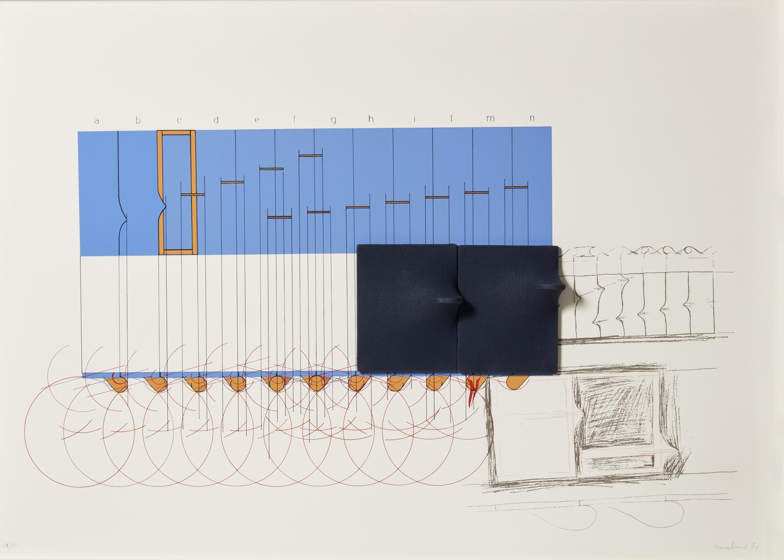 BONALUMI AGOSTINO (1935 - 2013) Senza titolo. 1971. Multiplo. Cm 100,00 x 70,00. 69/100. Tiratura, firma e anno in basso a matita. Timbro a secco Schoeller Schammer in alto a sinistra. Cornice presente