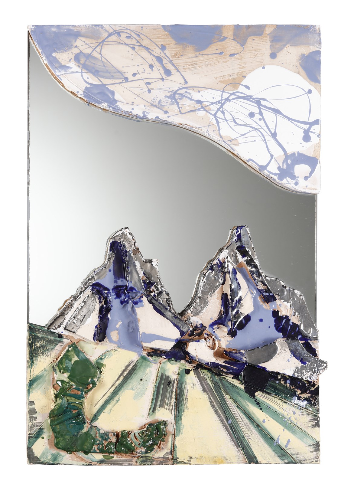 FIORONI GIOSETTA (n. 1932) Le montagne semoventi. 2006. Ceramica e specchio. Cm 47,00 x 70,00 x 4,00. Autentica dell'artista su fotografia con timbro della Fondazione Goffredo Parise e Giosetta Fioroni, Roma.