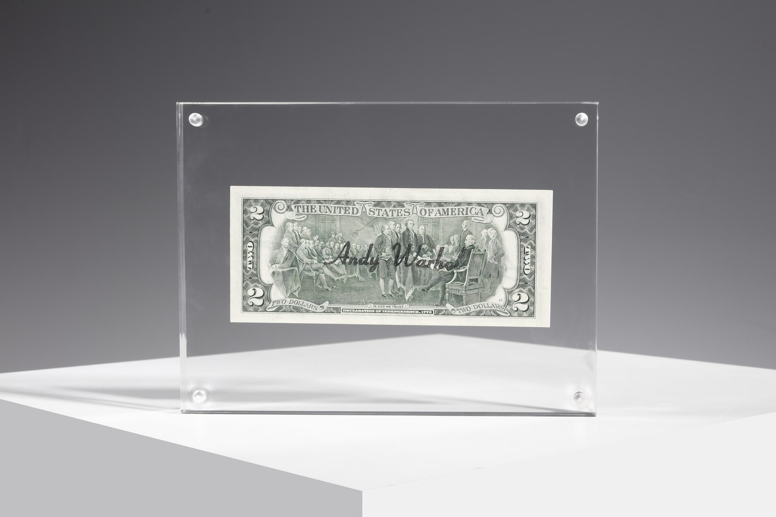 WARHOL ANDY (1928 - 1987) (ATT.TO).Two dollars (Thomas Jefferson). 1976. Intervento su banconota. Cm 15,50 x 6,60. Firma a pennarello e timbro Andy Warhol. Certificato di garanzia e provenienza Galerie 32, Nizza. Cornice presente