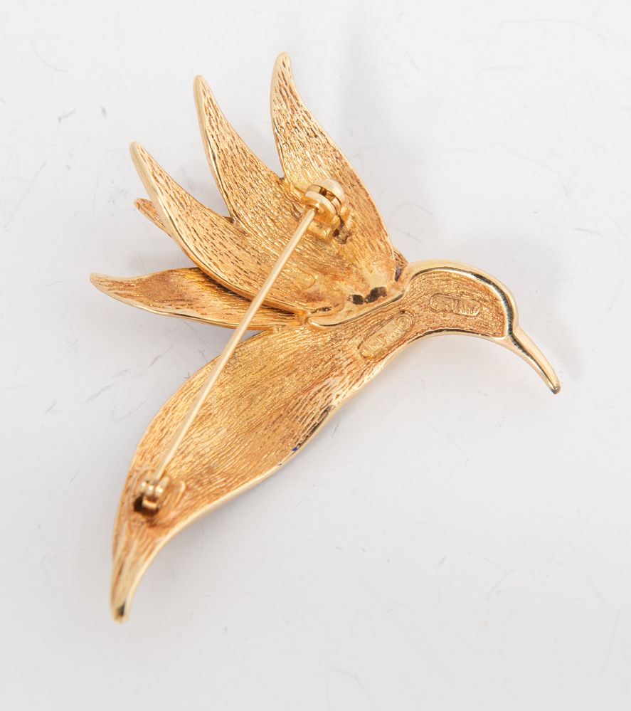 CHRISTIAN DIOR Spilla in metallo dorato e smaltato a forma di Colibrì. Cm 6x5. Reca marchio Chr. Dior Germany.
