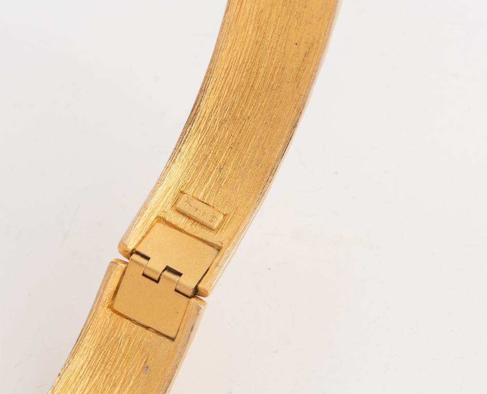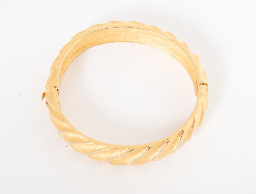 TRIFARI Bracciale rigido a fascia in metallo dorato e lavorato con chiusura a scatto. Diametro: cm 7,5. Spessore fascia: cm 1,5. Reca marchio Trifari.