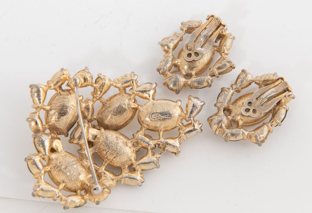 SCHIAPARELLI Parure composta da spilla orecchini a clip in metallo dorato...