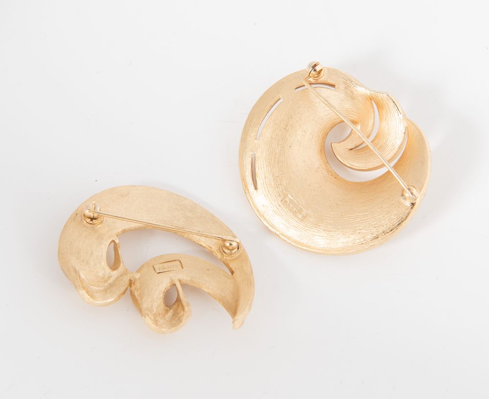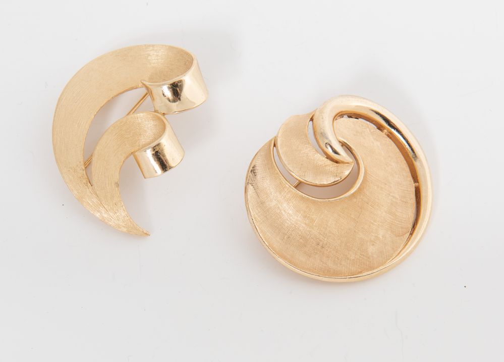 TRIFARI Coppia di spille in metallo dorato lucido e satinato. Rispettivamente di misure: cm 4,5x4,5; cm 4,7x3,5. Ciascuna reca marchio Trifari.