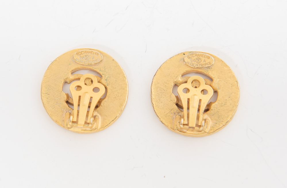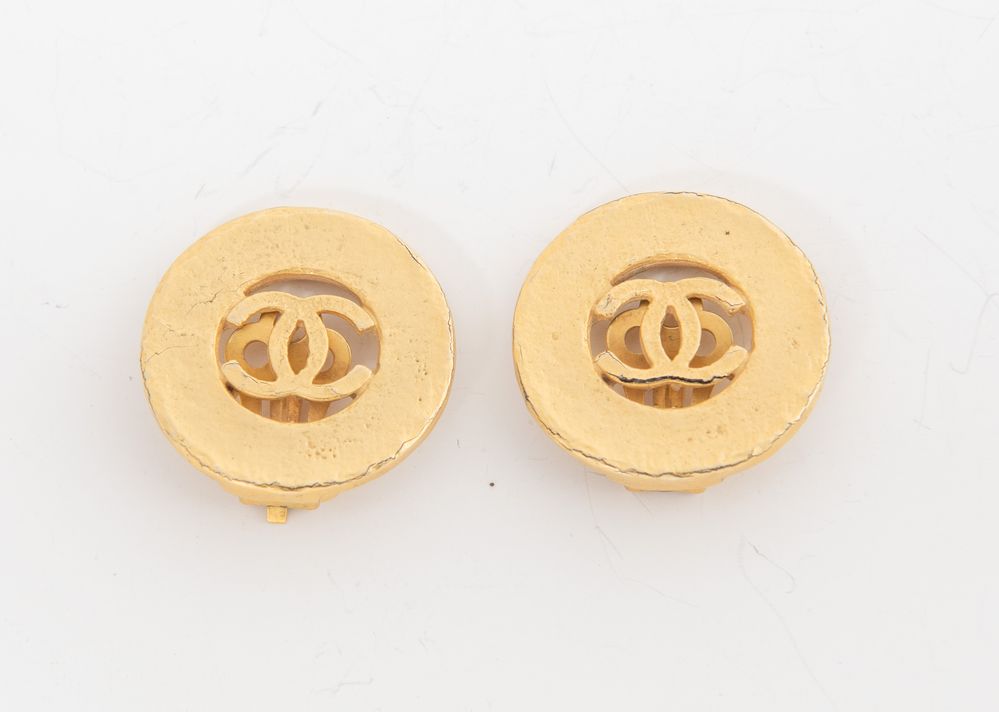 CHANEL Orecchini in metallo dorato con logo della maison. Diametro: cm 2,5 cad. Ciascuno reca marchi Chanel, 94, Made in France.