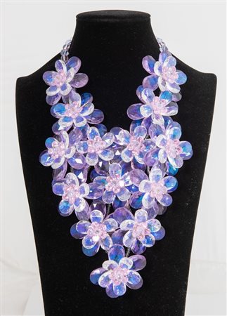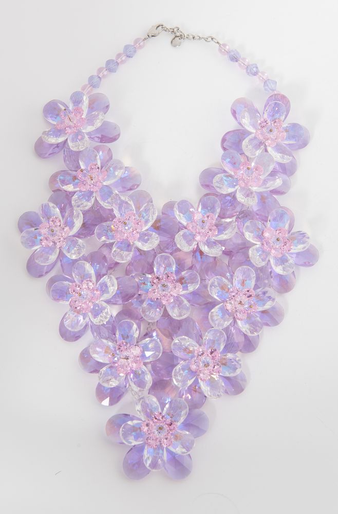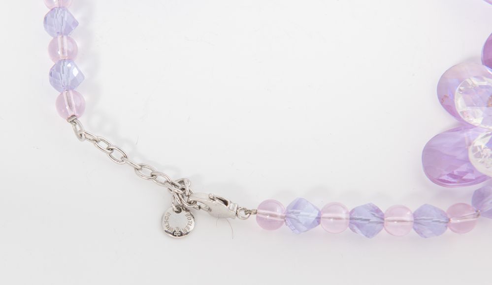 BUTLER & WILSON Collana girocollo di importanti dimensioni di gusto floreale realizzata con perle di cristallo di varie dimensioni sui toni del rosa e del lilla. Circonferenza collo: cm 40. Altezza totale pendente centrale: cm 17. Reca marchio Butler & Wilson.