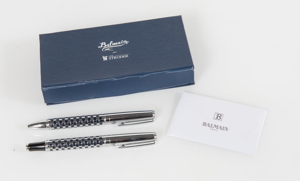 BALMAIN Set composto da due penne a sfere in metallo argentato e smaltato nero entro cofanetto originale. Ciascuna reca marchi Balmain. Accompagnate da certificato di autenticità Balmain Paris.