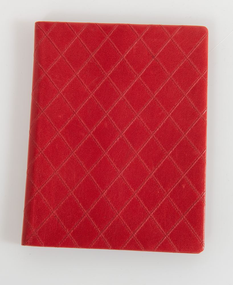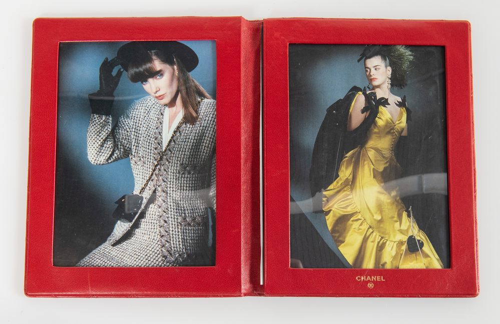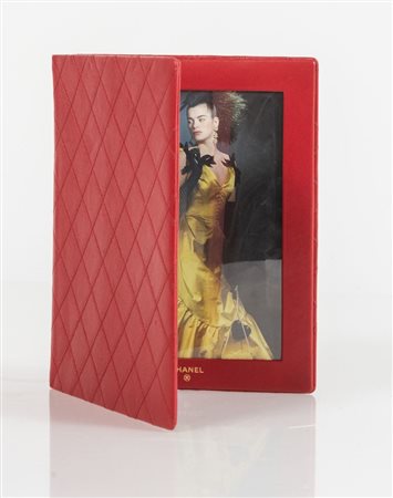 CHANEL Cornice/portafoto in pelle rossa liscia e lavorata a motivo trapuntato. Chiuso: cm 20,5x16. Aperto: cm 20,5x32,5. Reca marchi Chanel, Made in France.