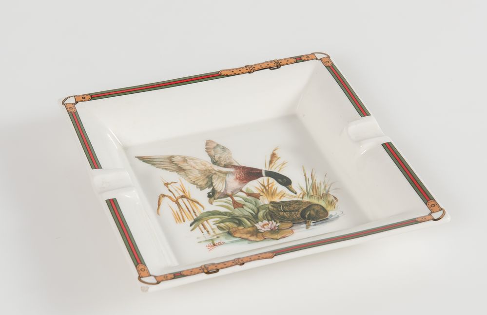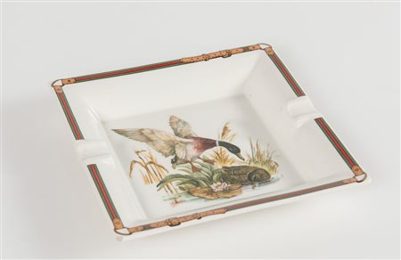 GUCCI Posacenere in porcellana smaltata. Anni '60/'70. Cm 19x18,5. Reca marchio Gucci. (Lievi difetti)