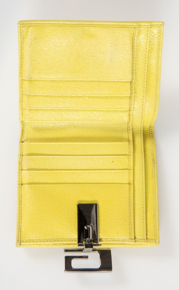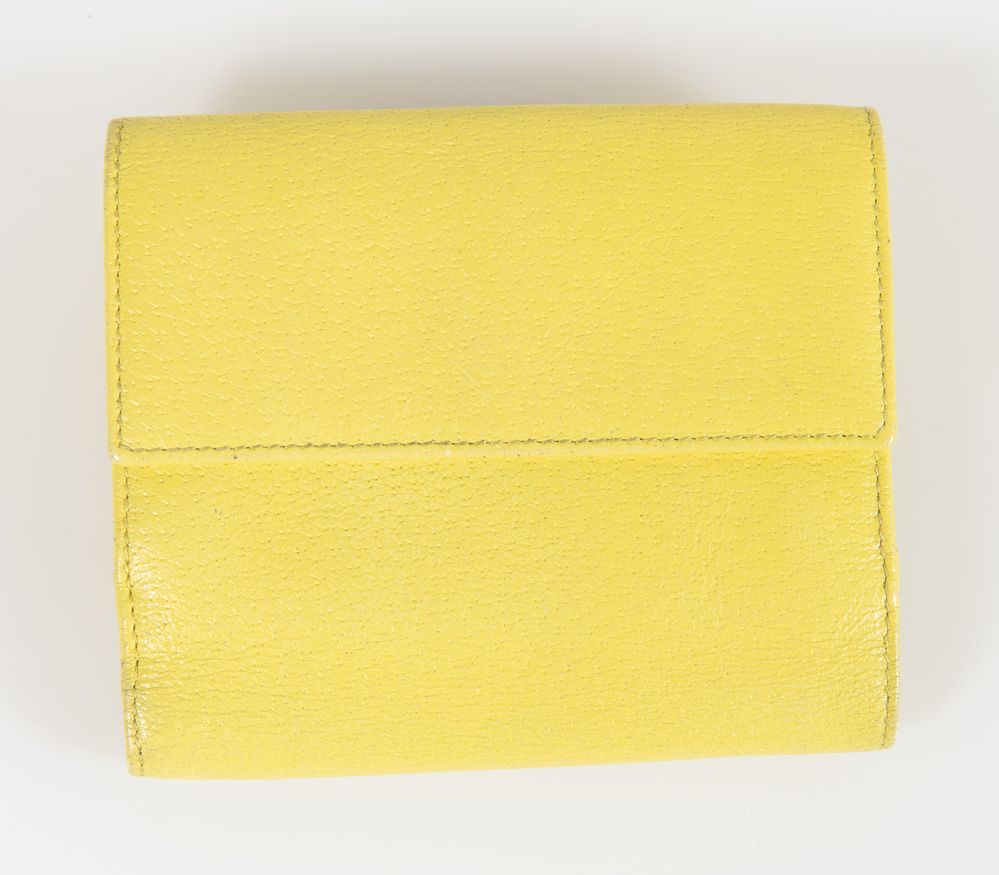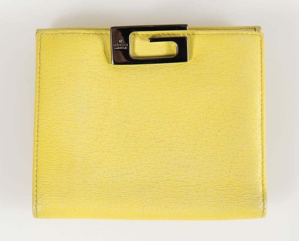 GUCCI Portafoglio in pelle lavorata color giallo. Cm 12x10,5x2. Reca marchi Gucci, Made in Italy. (Lievi difetti)