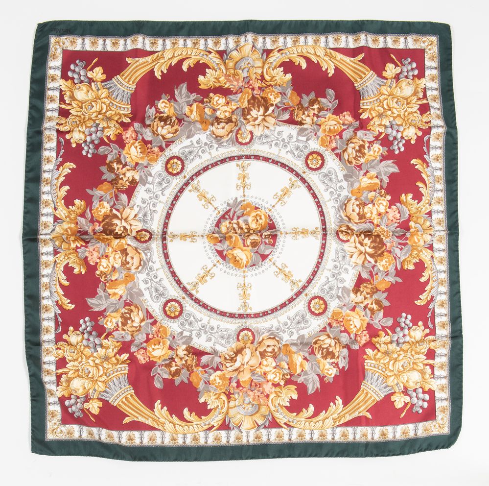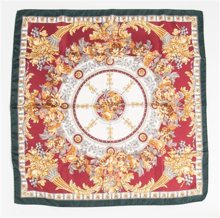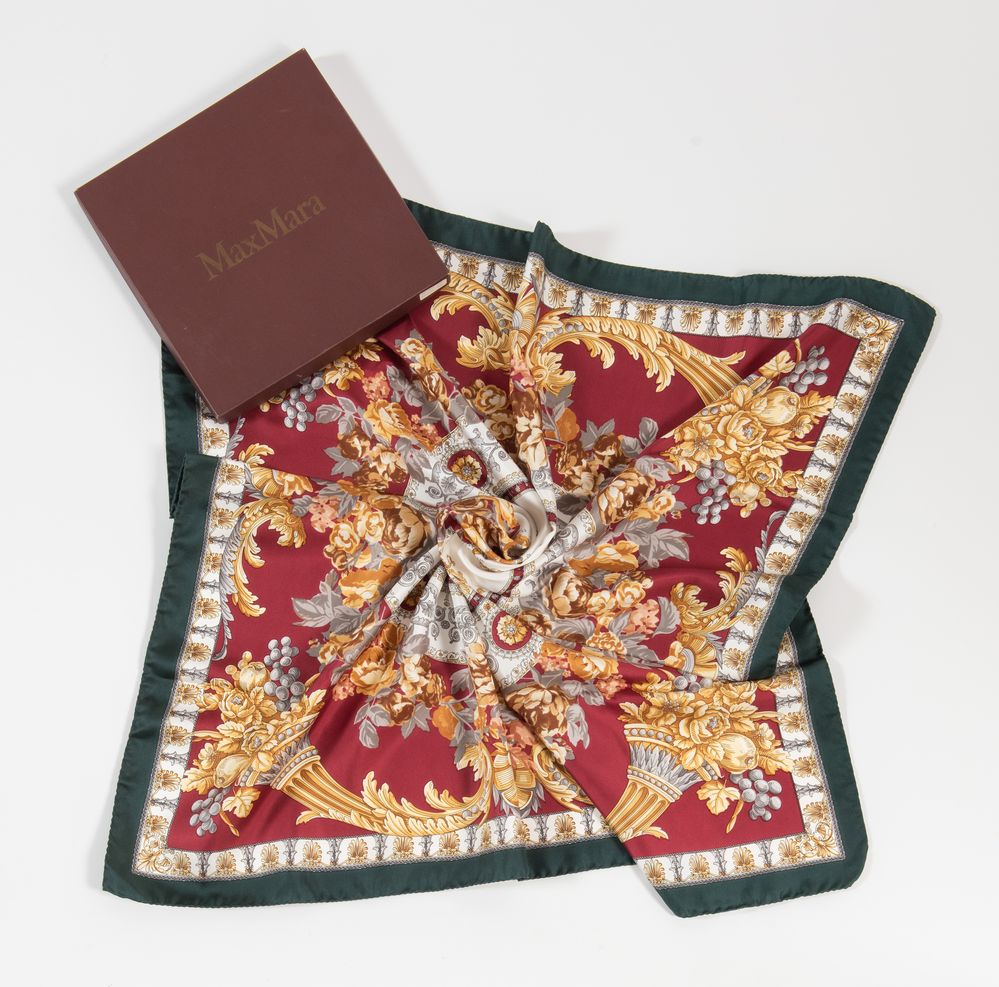 MAX MARA Foulard in seta sui toni del beige, bordeaux e verde. Cm 89x89. Composizione: 100% seta. Reca marchio ed etichetta Made in Italy. Corredato di scatola originale.