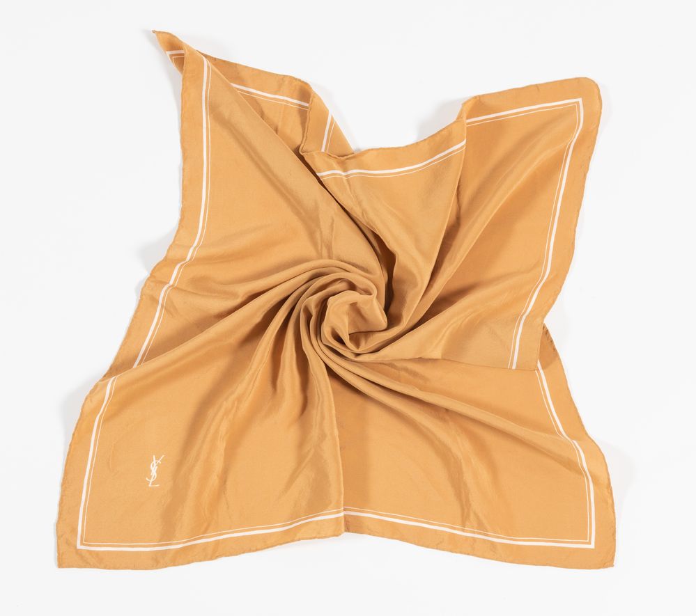 YVES SAINT LAURENT Foulard in seta. Cm 62x62. Reca marchio YSL. (Lievi mancanze)