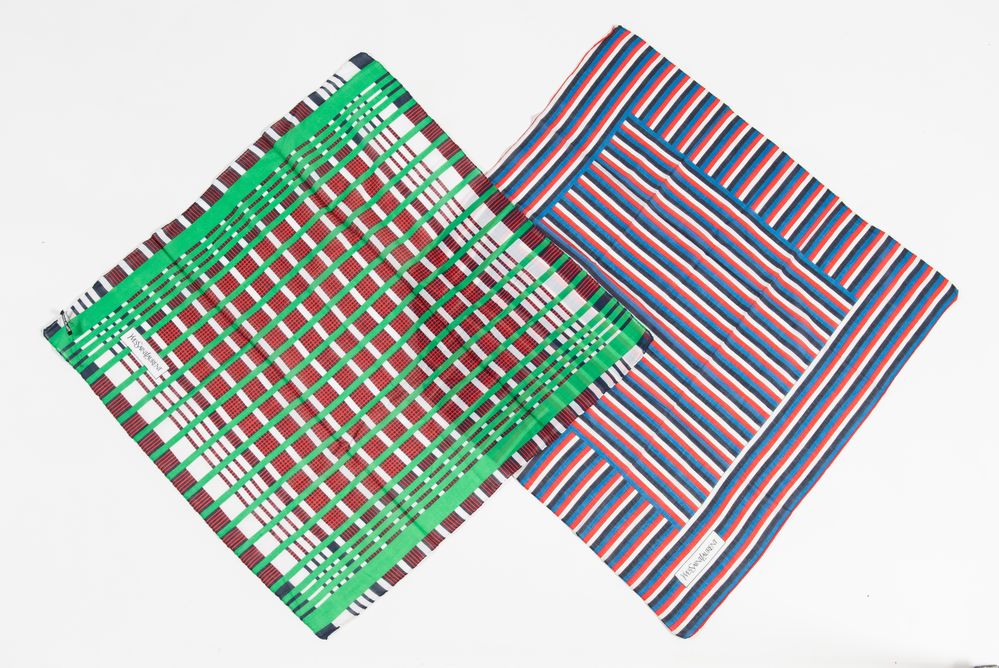 YVES SAINT LAURENT Lotto composto da due foulard in cotone. Rispettivamente di misure: cm 66x66 cad. Composizione: 100% cotone. Recano marchi Yves Saint Laurent, Made in Italy.