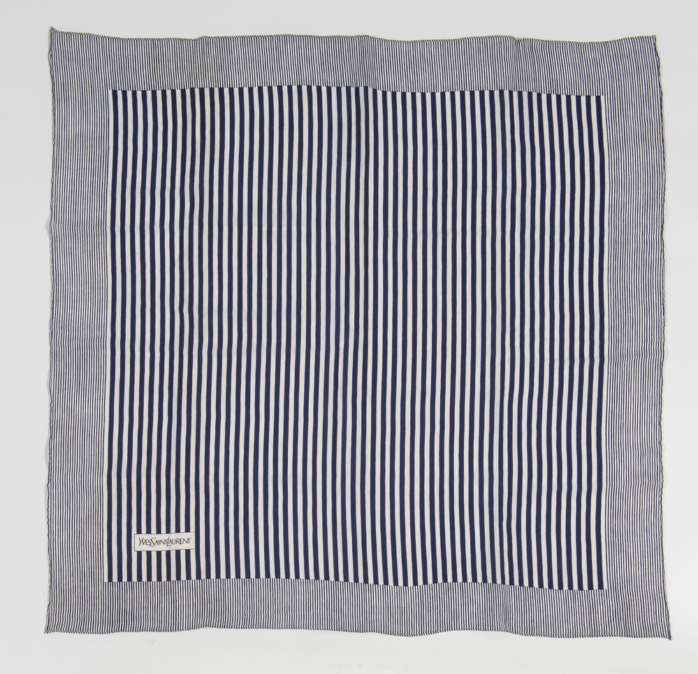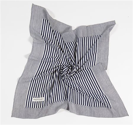 YVES SAINT LAURENT Foulard in seta con fantasia a righe bianche e blu. Cm 86x86. Reca marchio Yves Saint Laurent.