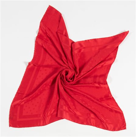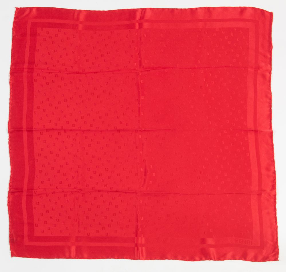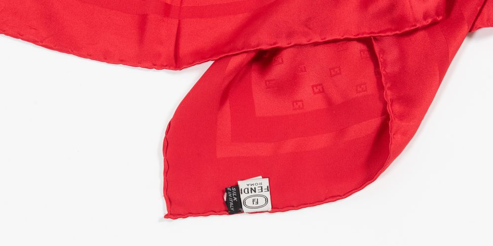 FENDI Foulard in seta rossa logato. Cm 89x89. Composizione: 100% seta. Reca etichette Fendi Roma, Made in Italy.