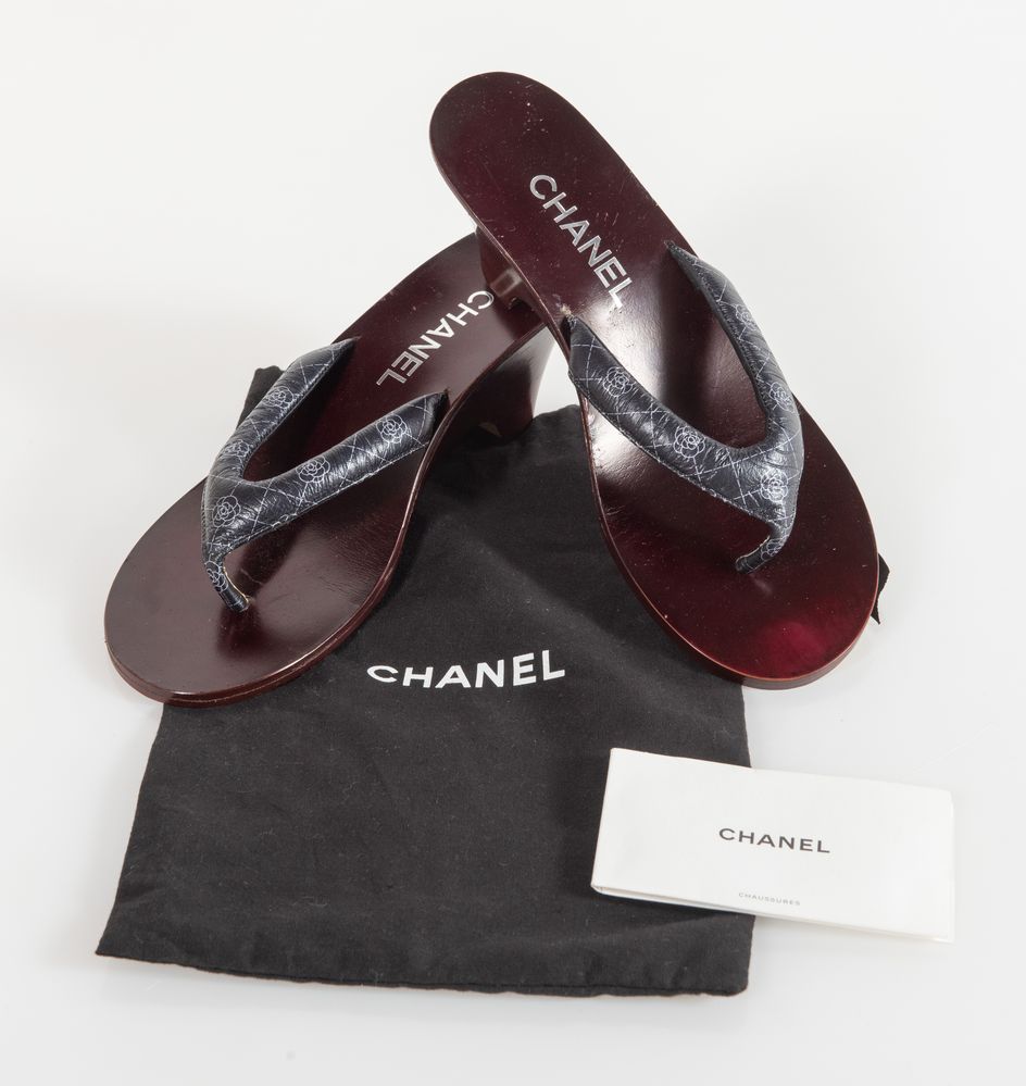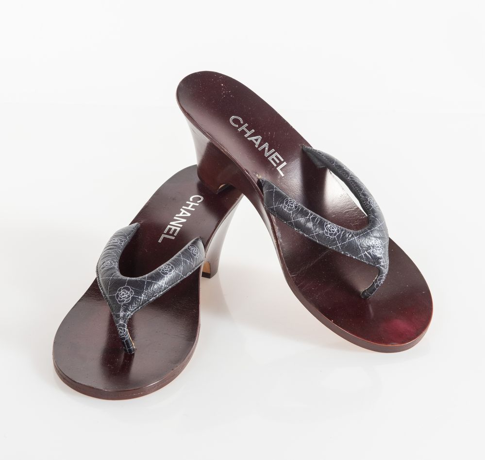 CHANEL Sandali modello sabot infradito rifiniti in pelle con zeppa in legno. Taglia riportata: 38. Altezza tacco: cm 6,8. Recano marchi CC, Chanel, Made in Italy. Corredati di dustbag e certificato.