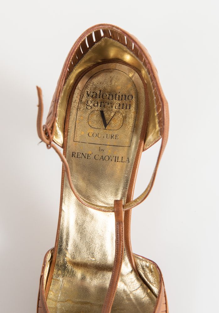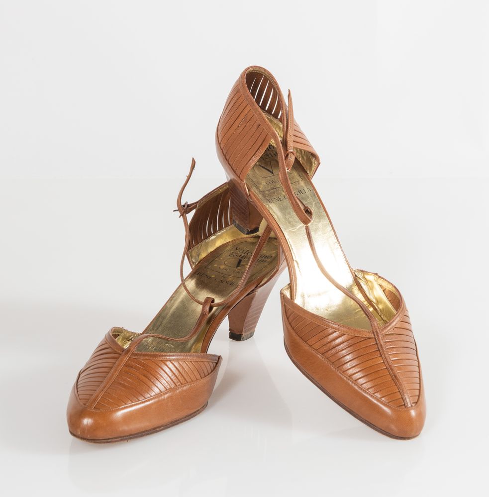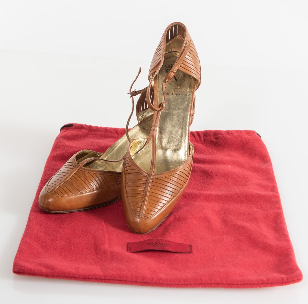 VALENTINO GARAVANI Couture by René Caovilla Decollete in pelle color cuoio e tacco in legno. Taglia riportata: 8.5 (IT 38). Altezza tacco: cm 5.5. Ciascuna reca marchi Valentino Garavani Couture, Made in Italy, 8.5. Accompagnate da dustbag.