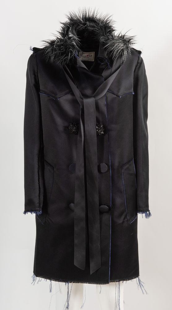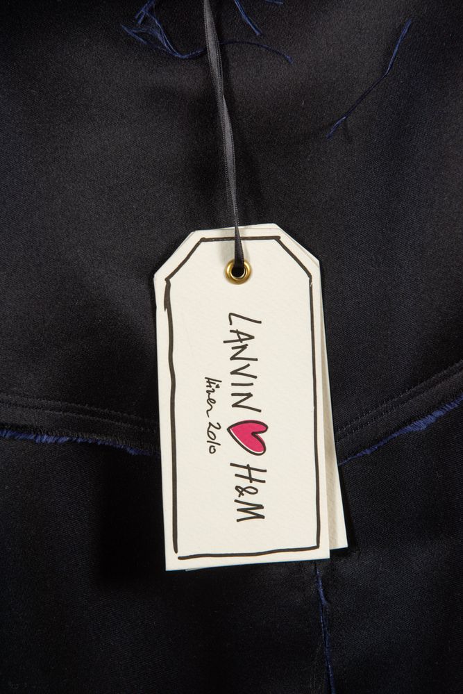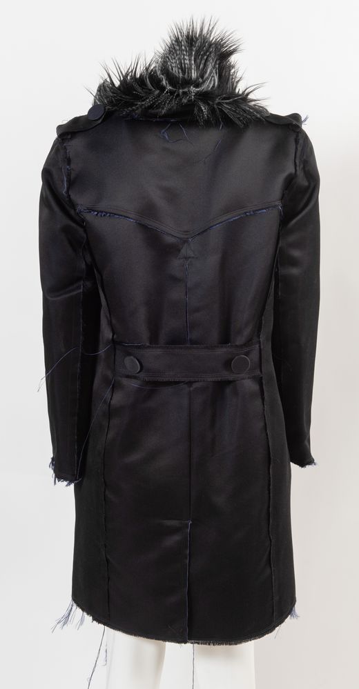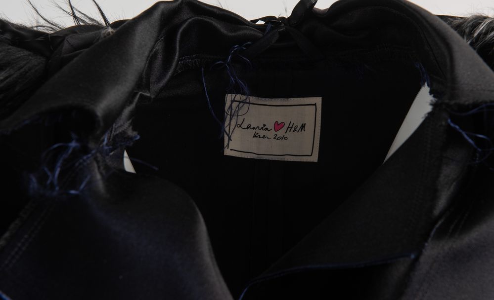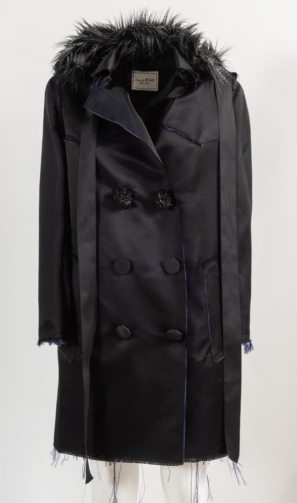 LANVIN x H&M Cappotto in stile trench in seta blu arricchito da bottoni in pietre sintetiche e da colletto in finta pelliccia. Presenta i bordi della stoffa tagliati a vivo e leggermente sfrangiati. Collezione anno 2010. Taglia riportata: EU 36/ US 6. Composizione esterno: 100% seta. Composizione fodera maniche: 100% poliestere. Composizione colletto in pelliccia sintetica: 72% mosacrilico, 22% poliestere, 6% acrilico. Reca etichetta Lanvin love H&M 2010.