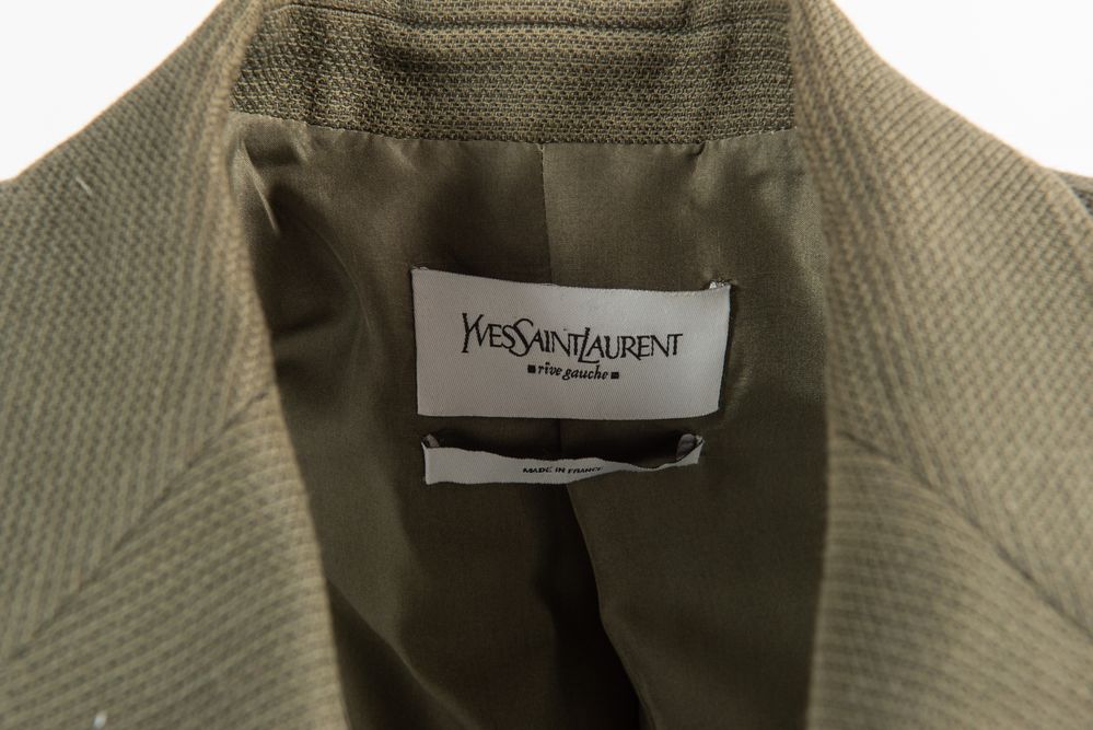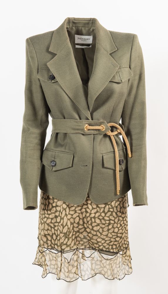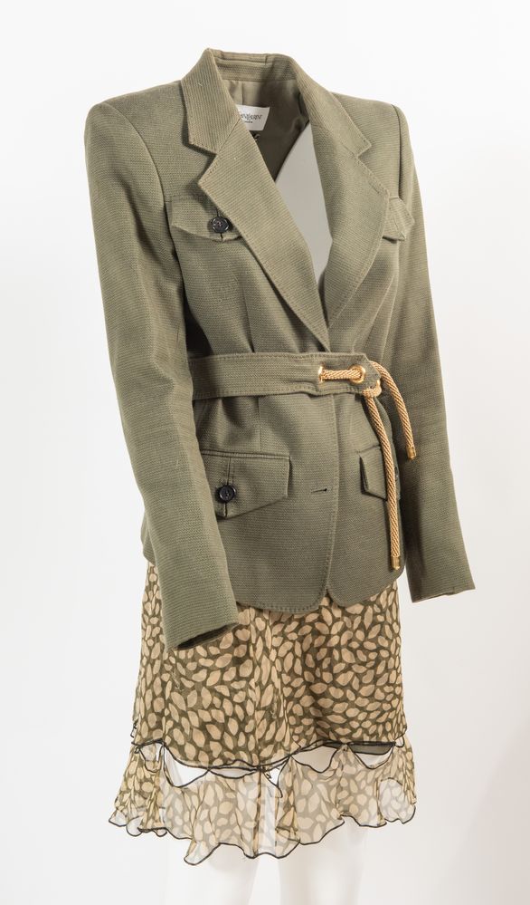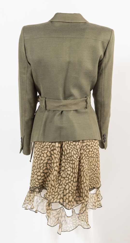 YVES SAINT LAURENT Rive gauche Completo tailleur composto da giacca e gonna verde oliva. Giacca in misto cotone con cintura annessa in corda e cotone. Interno in raso sintetico con marchio YSL ricamato. Gonna in seta a due strati con volant. Taglia non riportata: 42-44 ca. Reca etichette Yves Saint Laurent Rive gauche Made in France.