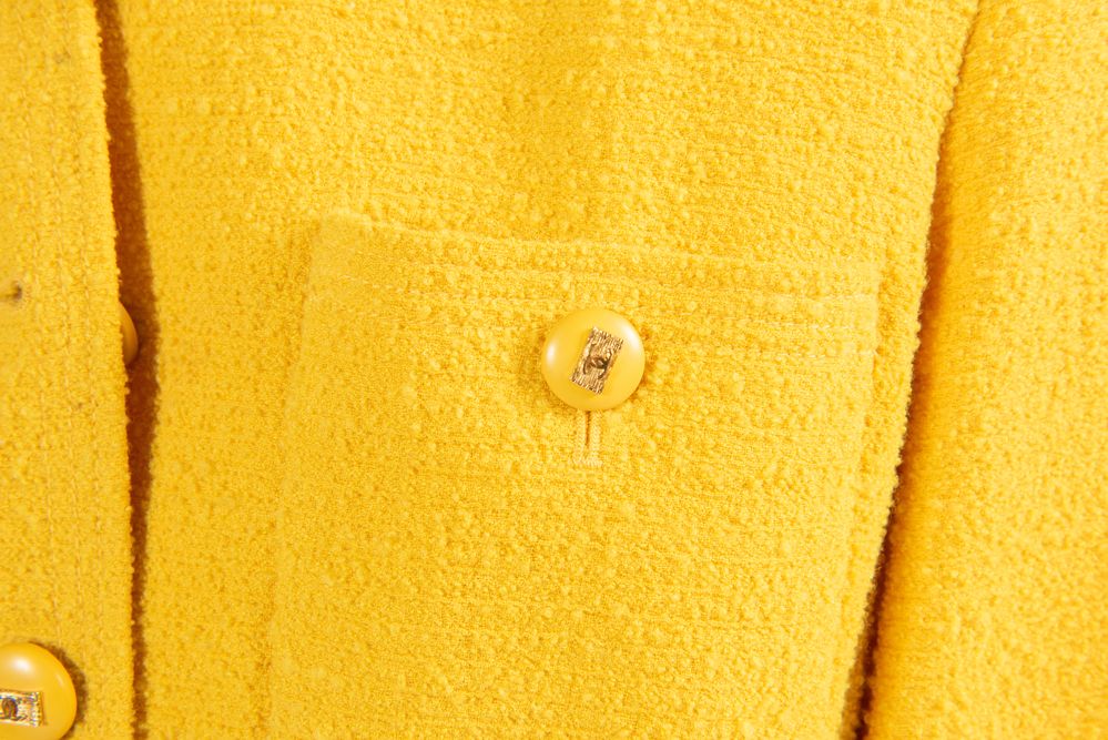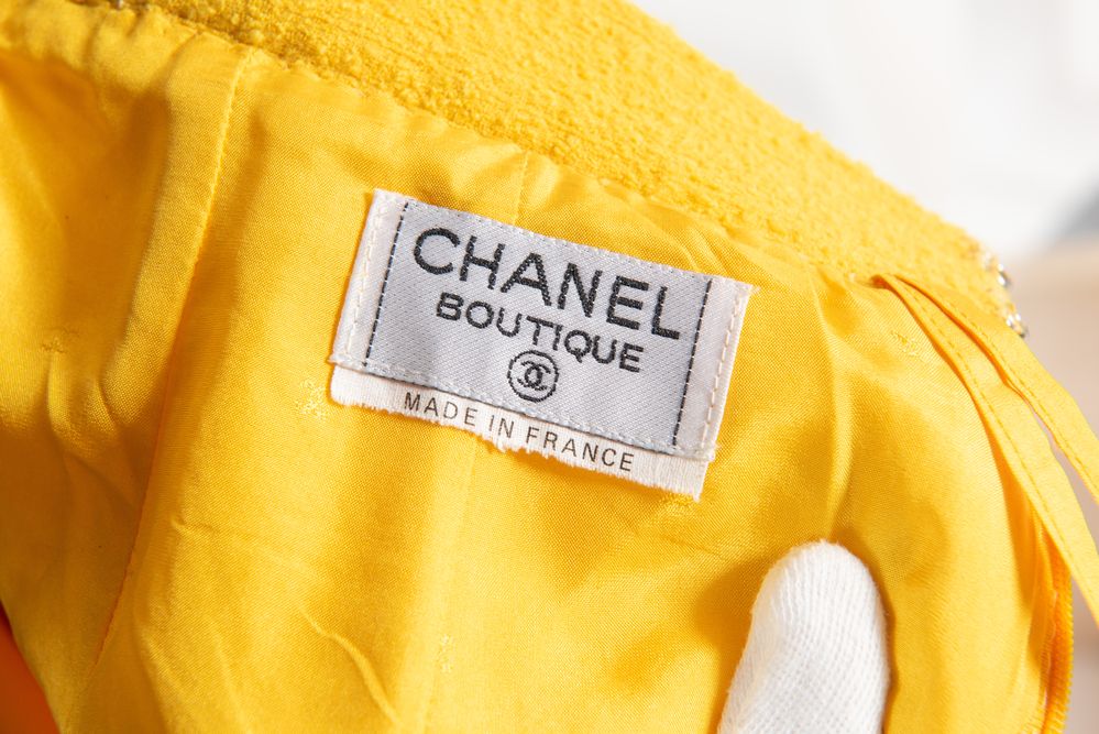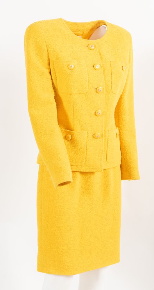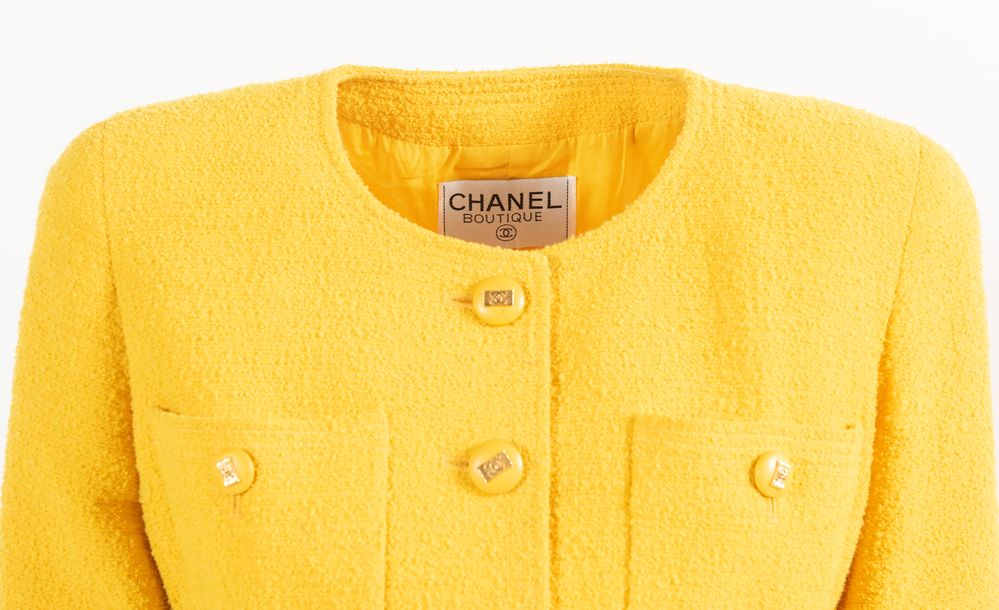 CHANEL Completo tailleur composto da giacca e gonna in lana bouclè monocolore giallo. e interno in seta logata. Dettagli del logo in metallo dorato sui bottoni. Taglia non riportata: 40 ca. Reca etichette Chanel Boutique e Chanel Boutique Made in France. (Lievi mancanze)