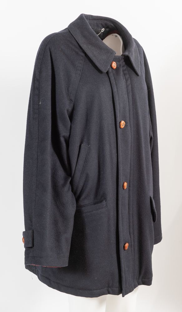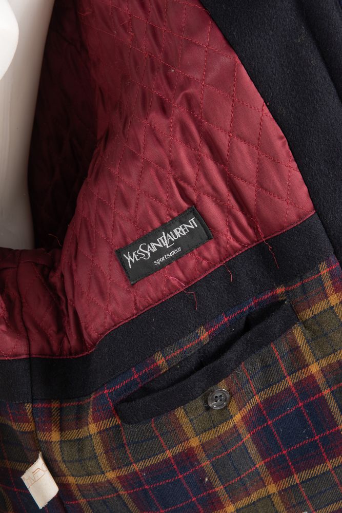 YVES SAINT LAURENT Sportswear Cappotto maschile di media lunghezza in lana blu con chiusura a lampo e bottoni in cuoio logati. Anni '90. Interno con tasca in raso trapuntato e lana con motivo tartan e monocolore bordeaux. Composizione esterno: 100% lana vergine. Composizione interno: 55% poliestere, 45% lana. Riporta taglia 52. Reca marchi YSL, etichette Yves Saint Laurent Sportswear e codici modello, articolo, colore.