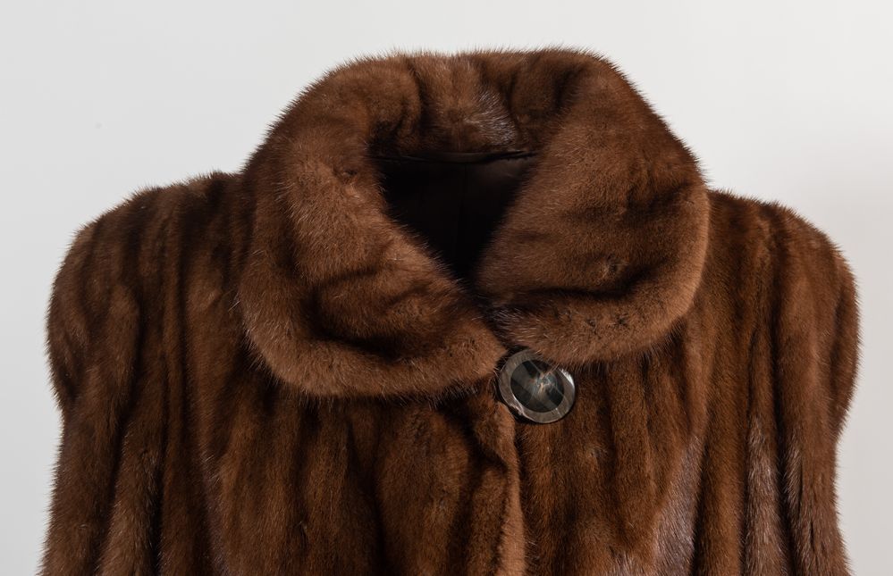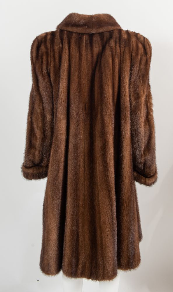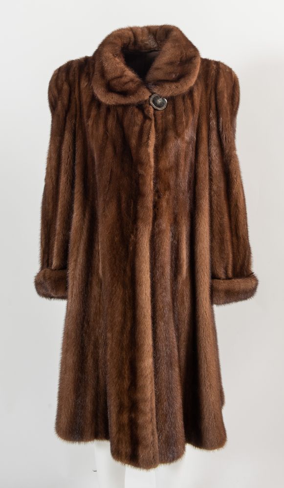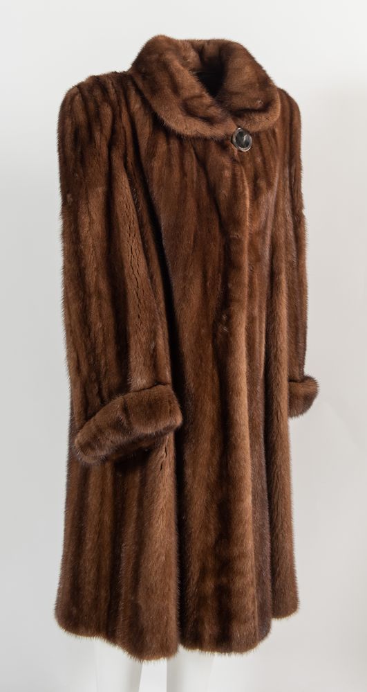 ANONIMO Cappotto in pelliccia di visone con interno rivestito in seta marrone. Taglia non riportata: 44 ca.