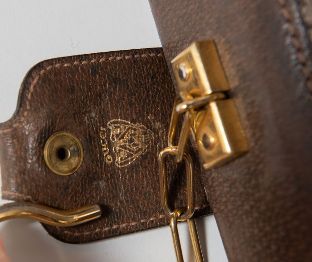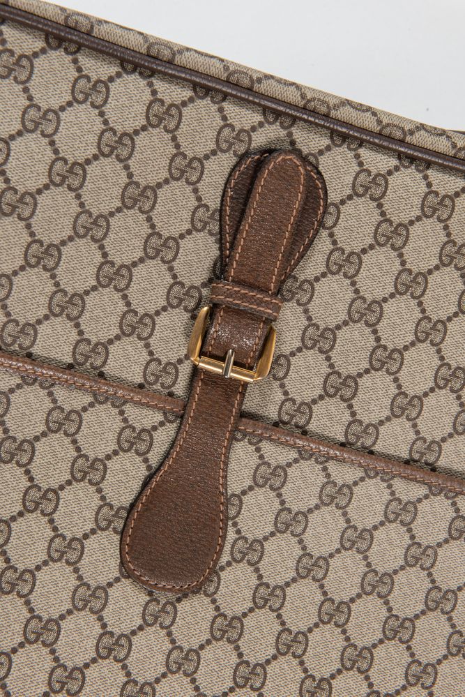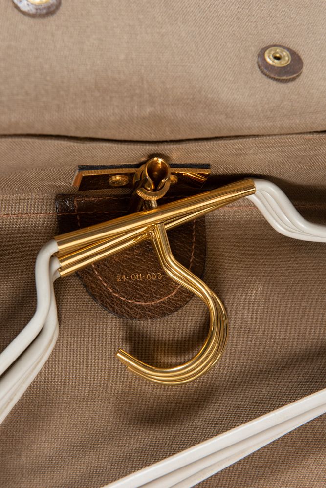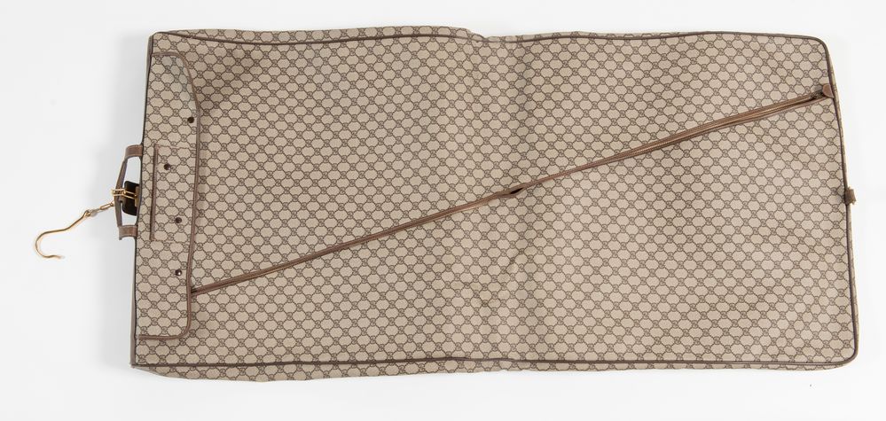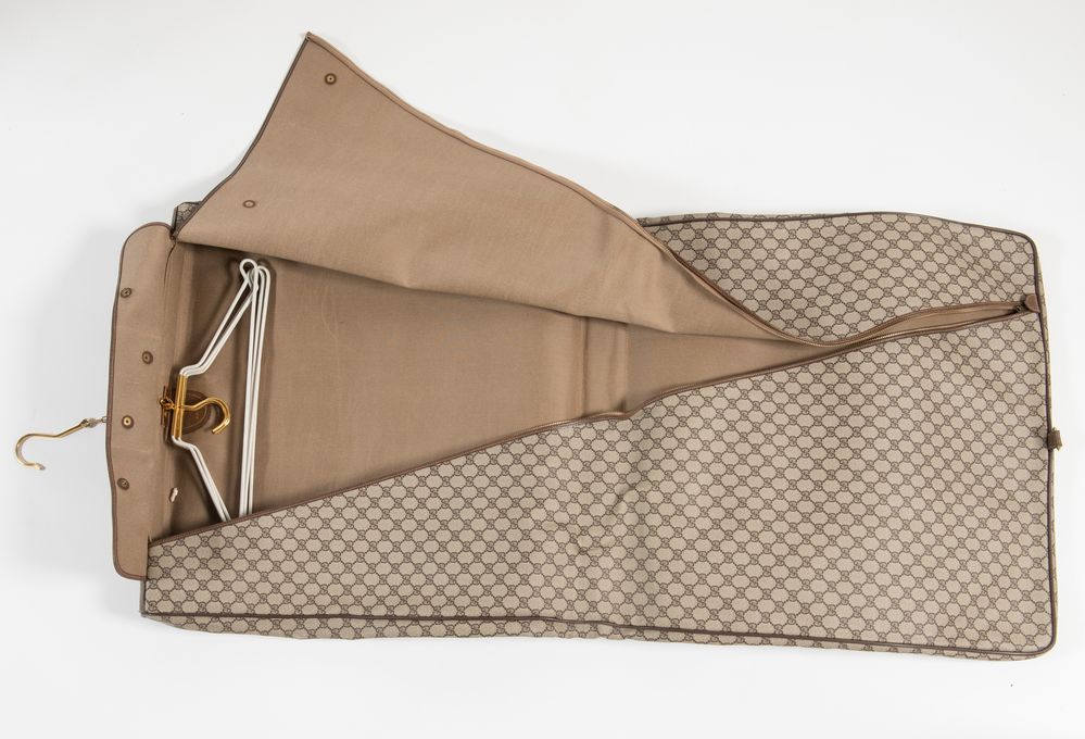 GUCCI Porta abiti pieghevole con manico in tela monogram con rifiniture in pelle marrone. Chiuso: cm 60x60x8,5. Aperto: cm 124x60. Reca marchi GG, Gucci Italy e codice riferimento prodotto. Corredato di quattro grucce originali.